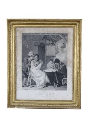 BELLA STAMPA intitolata Le Bon coinselle (il giusto consiglio) dentro cornice in legno dorato e intagliato Francia XIX secolo h cm 49 x 90