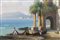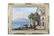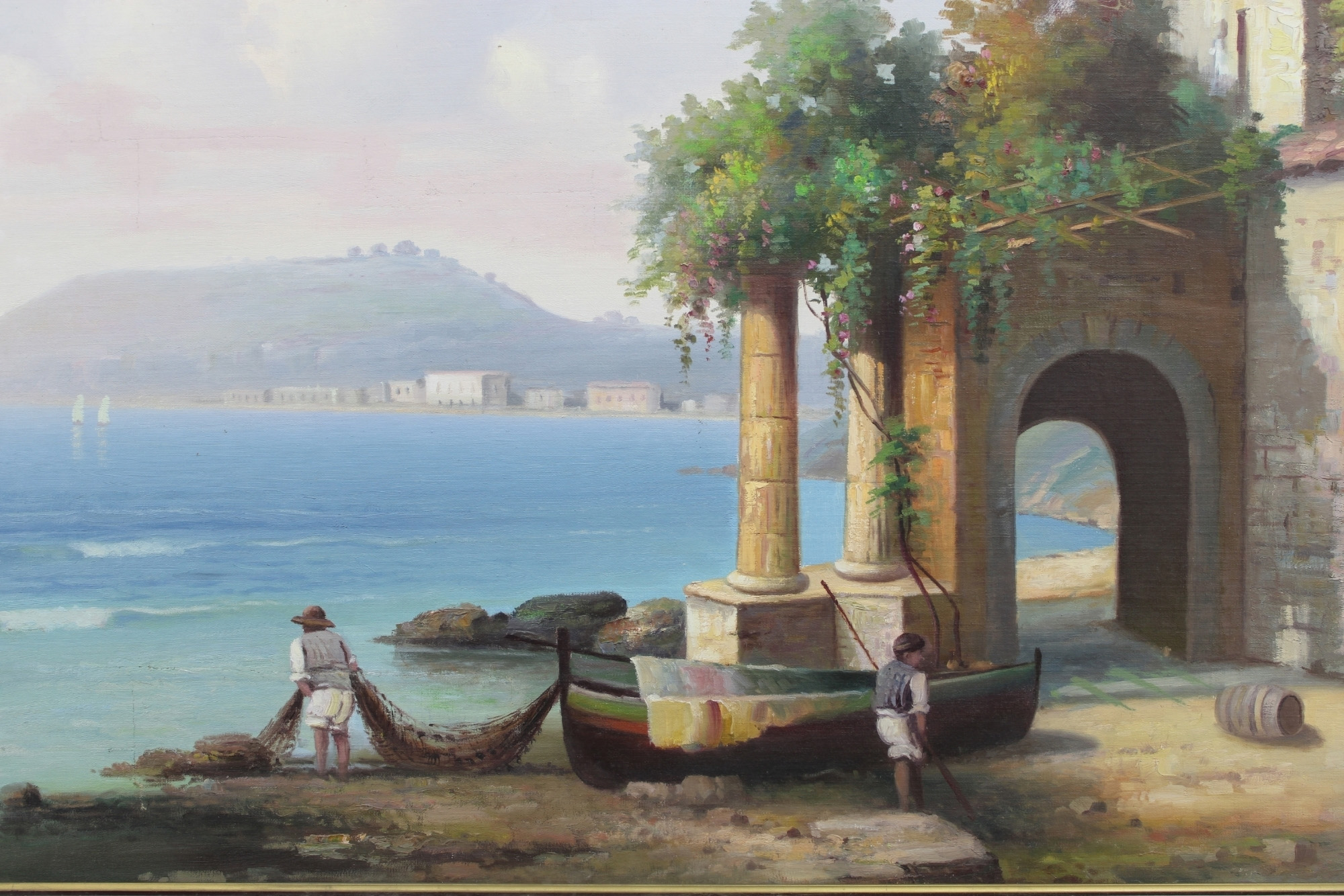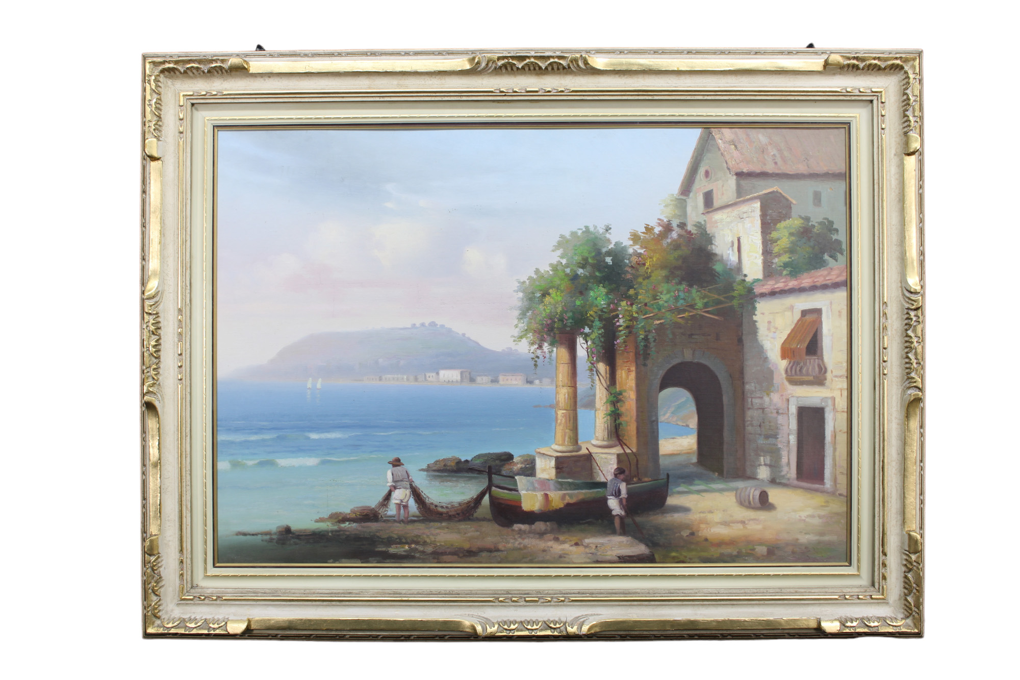 OLIO SU COMPENSATO raffigurante scorcio marinaro con barche e pescatori dentro cornice in legno laccato e dorato scuola siciliana XX secolo h cm 68 x 98