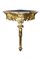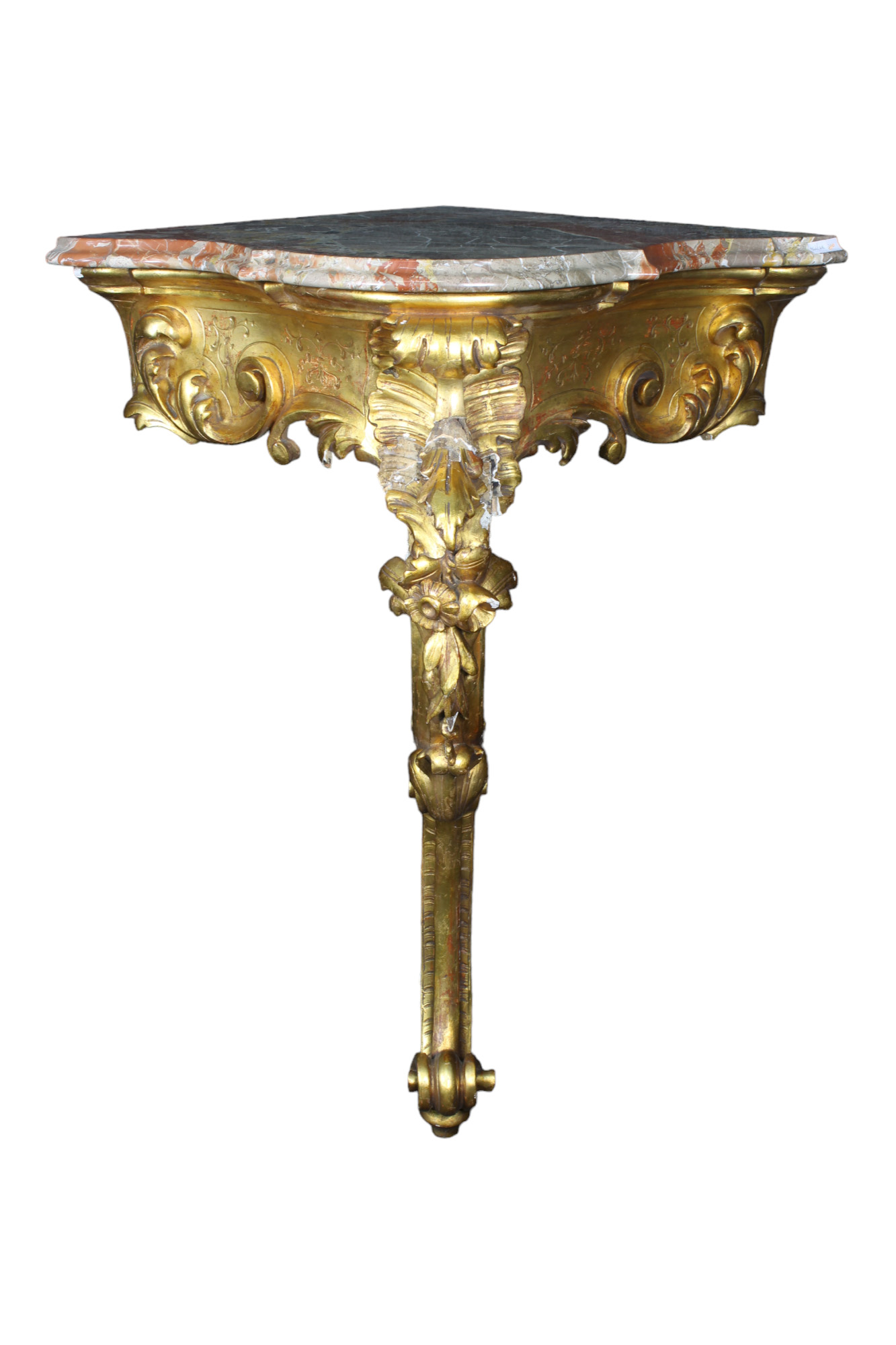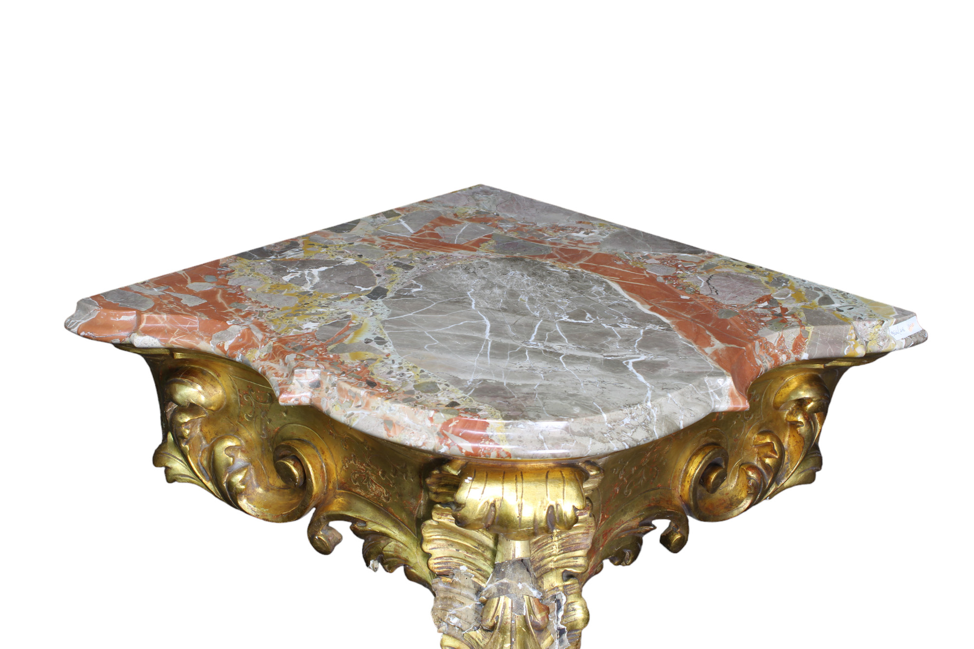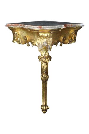 CONSOLLE AD ANGOLO sorretta da una gamba in legno scolpito e dorato ad oro zecchino, piano in marmo breccia francese Sicilia XIX secolo h cm 100 x 84 x 79