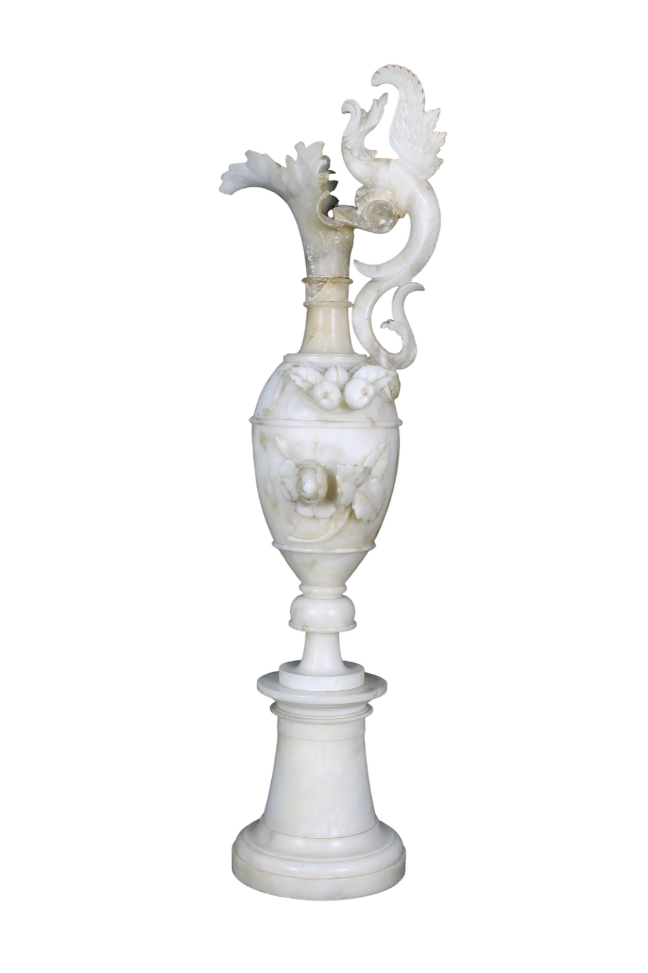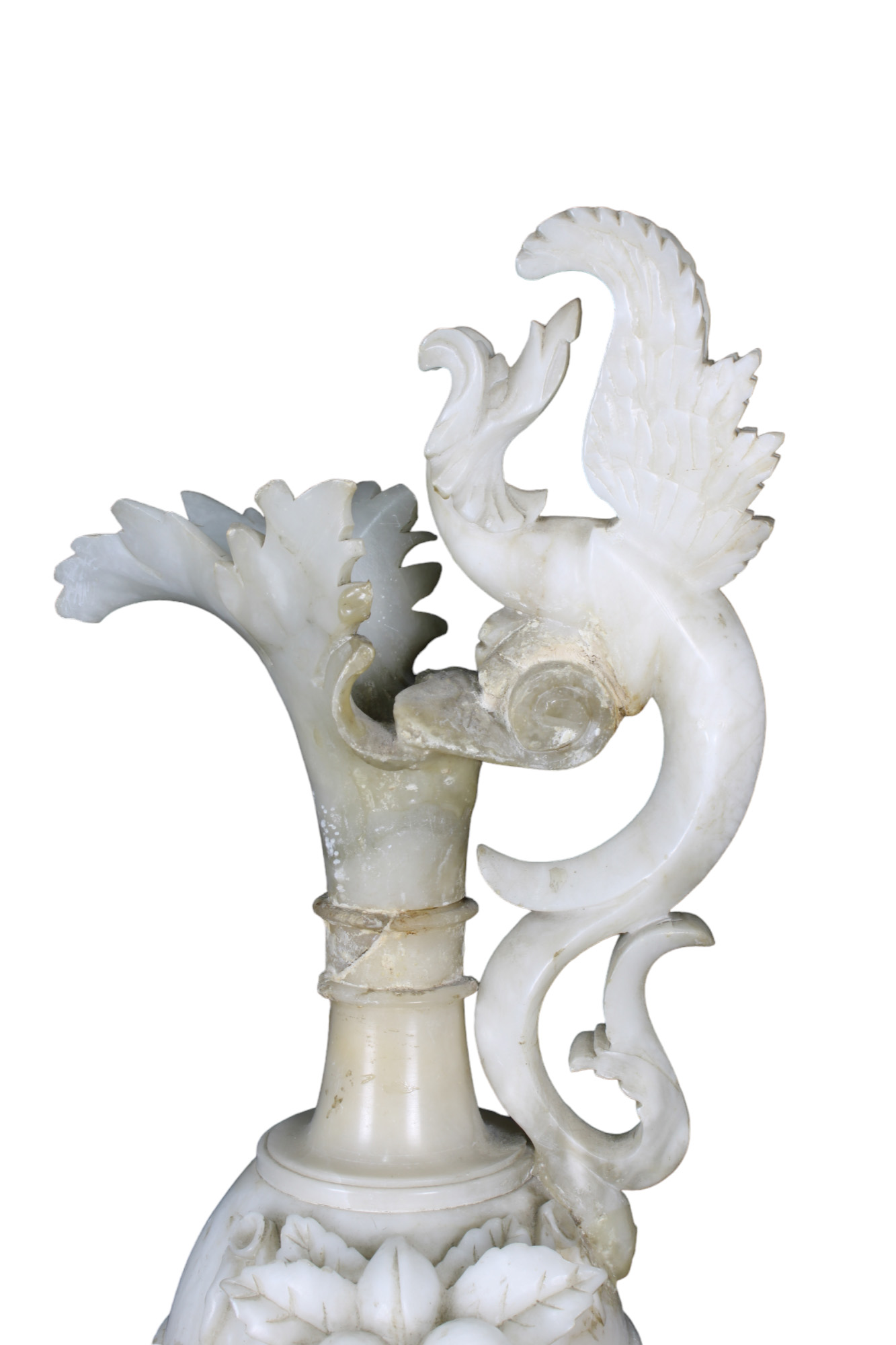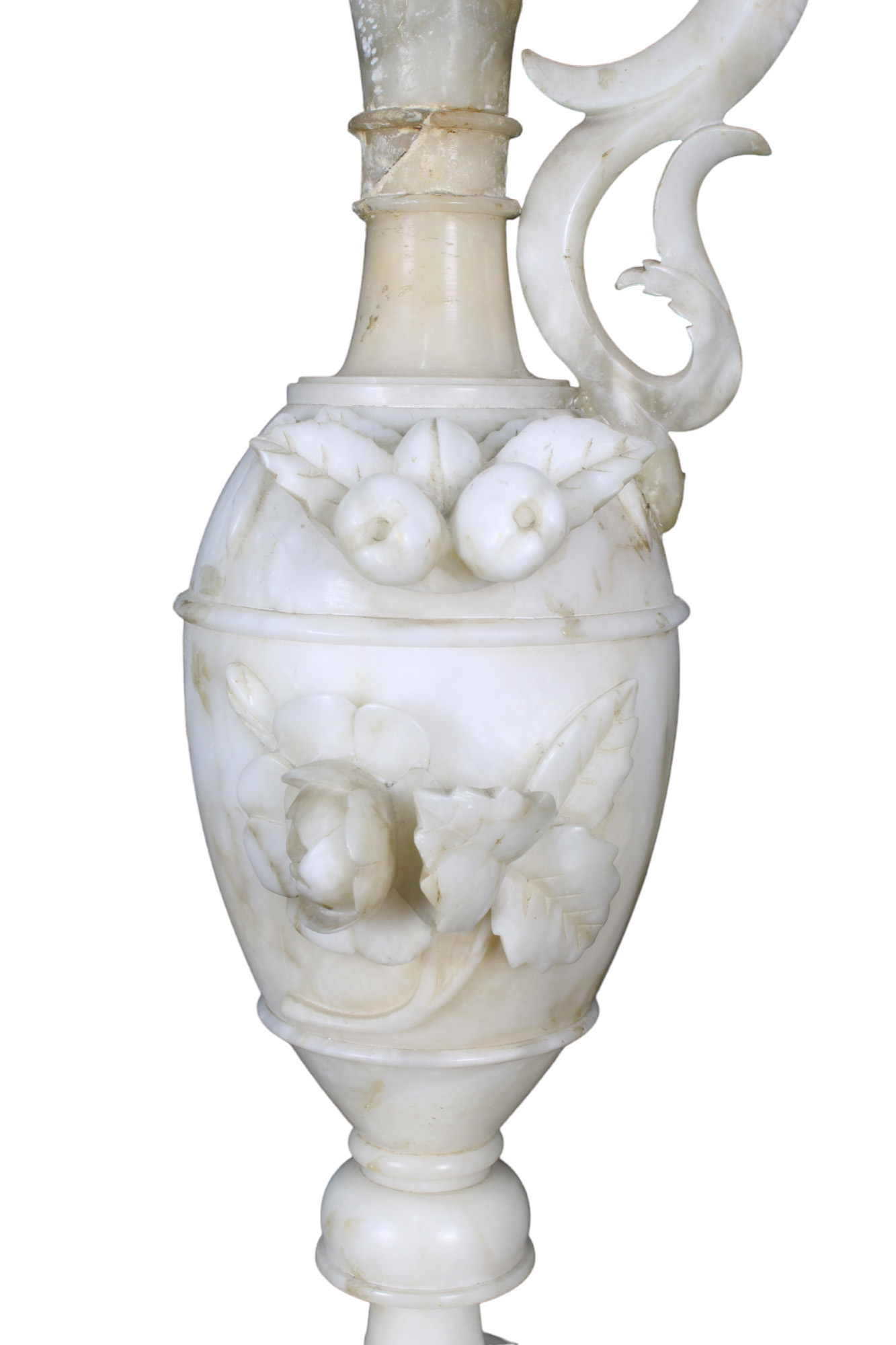 VASO AD ANFORA in alabastro scolpito a motivi floreali con manico raffigurante animale fantastico, incollagi e mancanze Volterra fine XIX secolo h cm 70 x 22