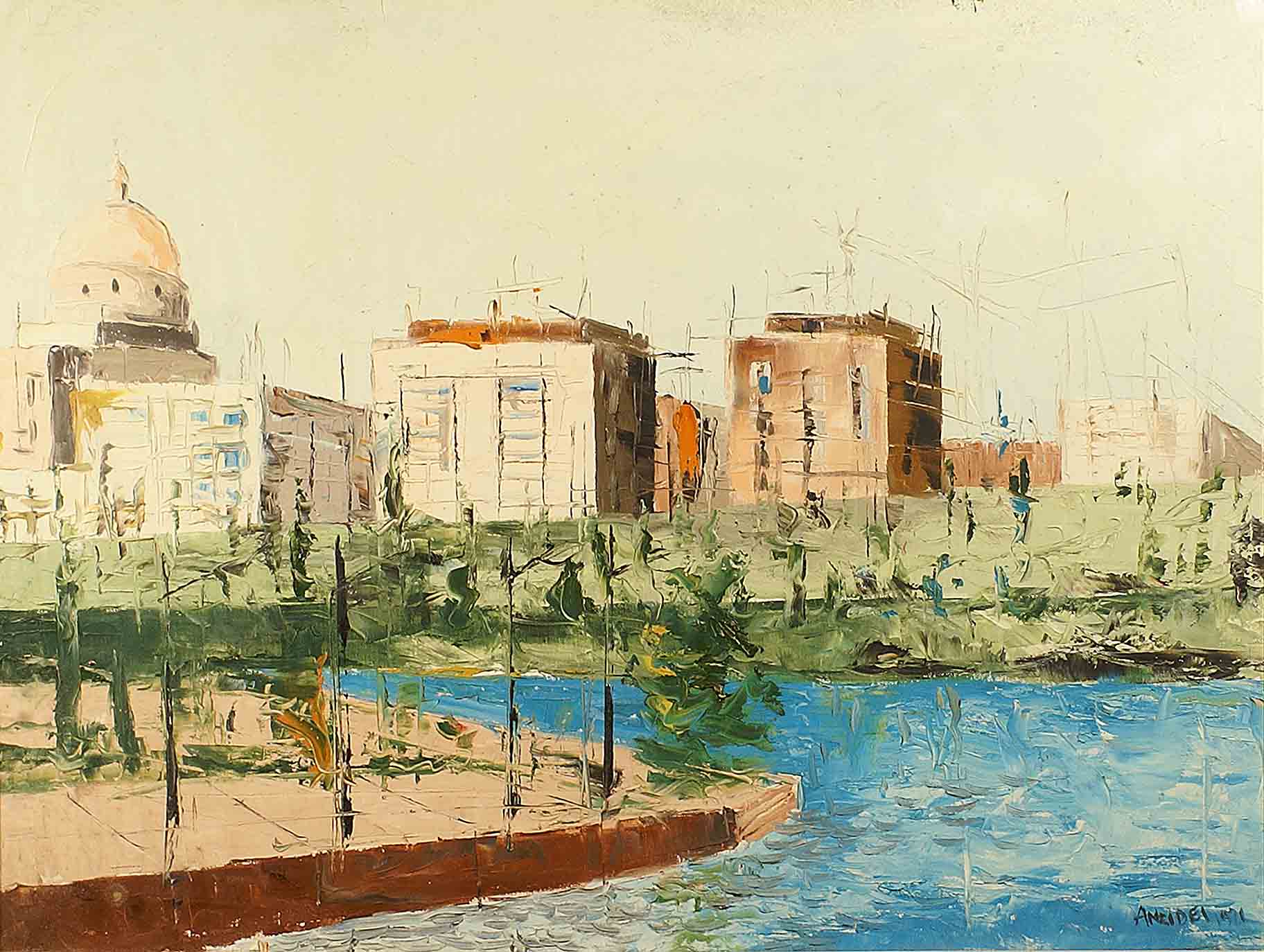 Amidei (XX secolo), "Scorcio di città", olio su tela, cm. 60x80, firmato e datato 1971 in basso a destra.