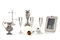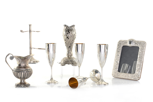 LOTTO DI DIVERSI OGGETTI IN ARGENTO, XX SECOLO, composto da quattro calici a flute con interni dorati, una cornice rettangolare con decori a rilievo, una lattiera baccellata, un portasapone da toilette, un vaso Liberty montato a lampada.