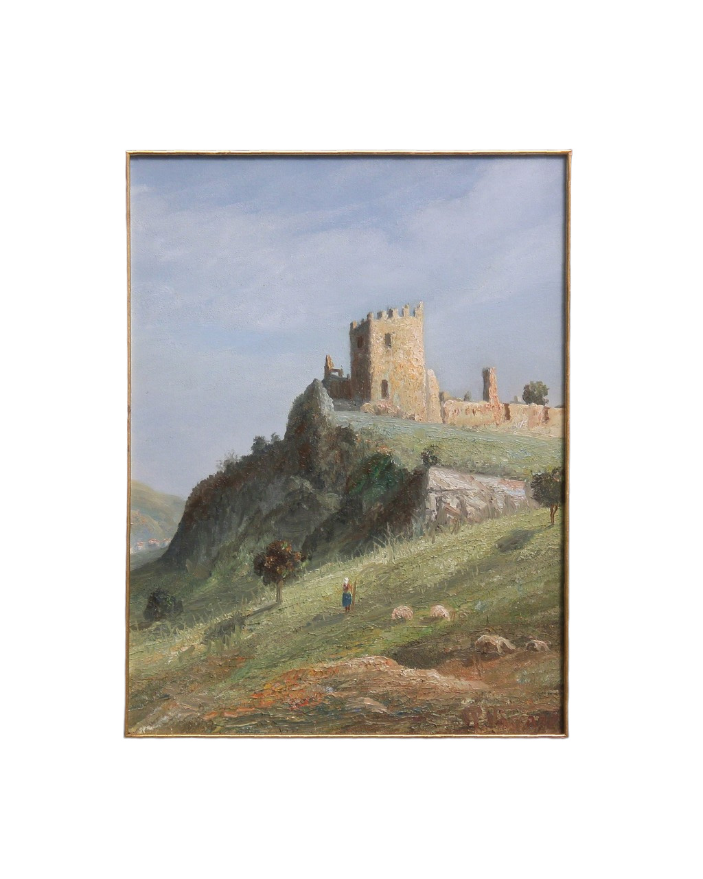 DIPINTO SU TELA raffigurante paesaggio con ruderi di un castello firmato Pietro Vaccaro pittore del XX secolo h cm 42,5 x 32