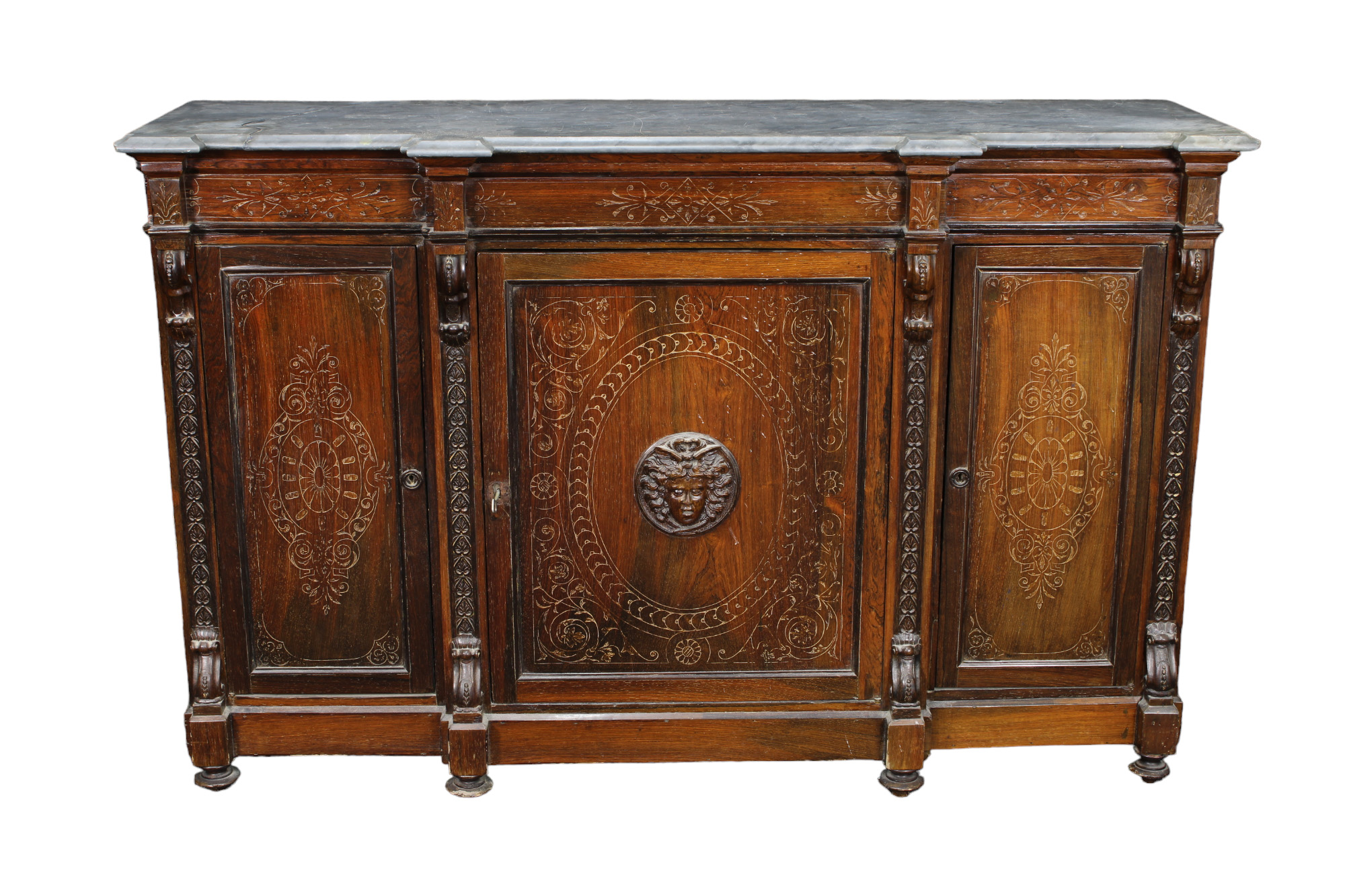 CREDENZA A 3 SPORTELLI in palissandro riccamente incisa e scolpita con fregio centrale raffigurante Medusa, piano in marmo grigio di Billiemi Sicilia XIX secolo h cm 100 x 158 x 47
