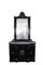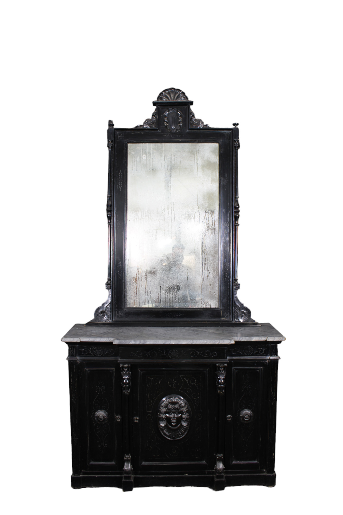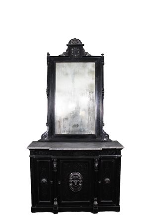 ETAGERE CON SPECCHIO a 3 sportelli in legno ebanizzato e scolpito raffigurante figure femminili e riccamente inciso, piano in marmo grigio di Billiemi Sicilia XIX secolo h cm 260 x 133 x 45