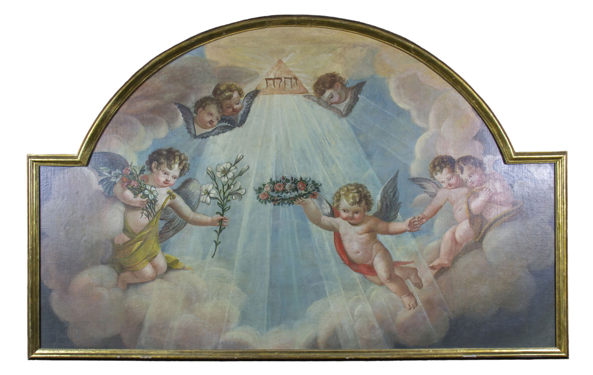 DIPINTO OLIO SU TELA raffigurante tripudio di angeli e cherubini metà del XVIII secolo Italia h cm 130 x 205 x 7