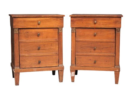 COPPIA COMODINI IMPERO in ciliegio a 4 tiretti, lesene arricchite da colonne piatte, cimate da capitelli in bronzo Sicilia XIX secolo h cm 77 x 58 x 38