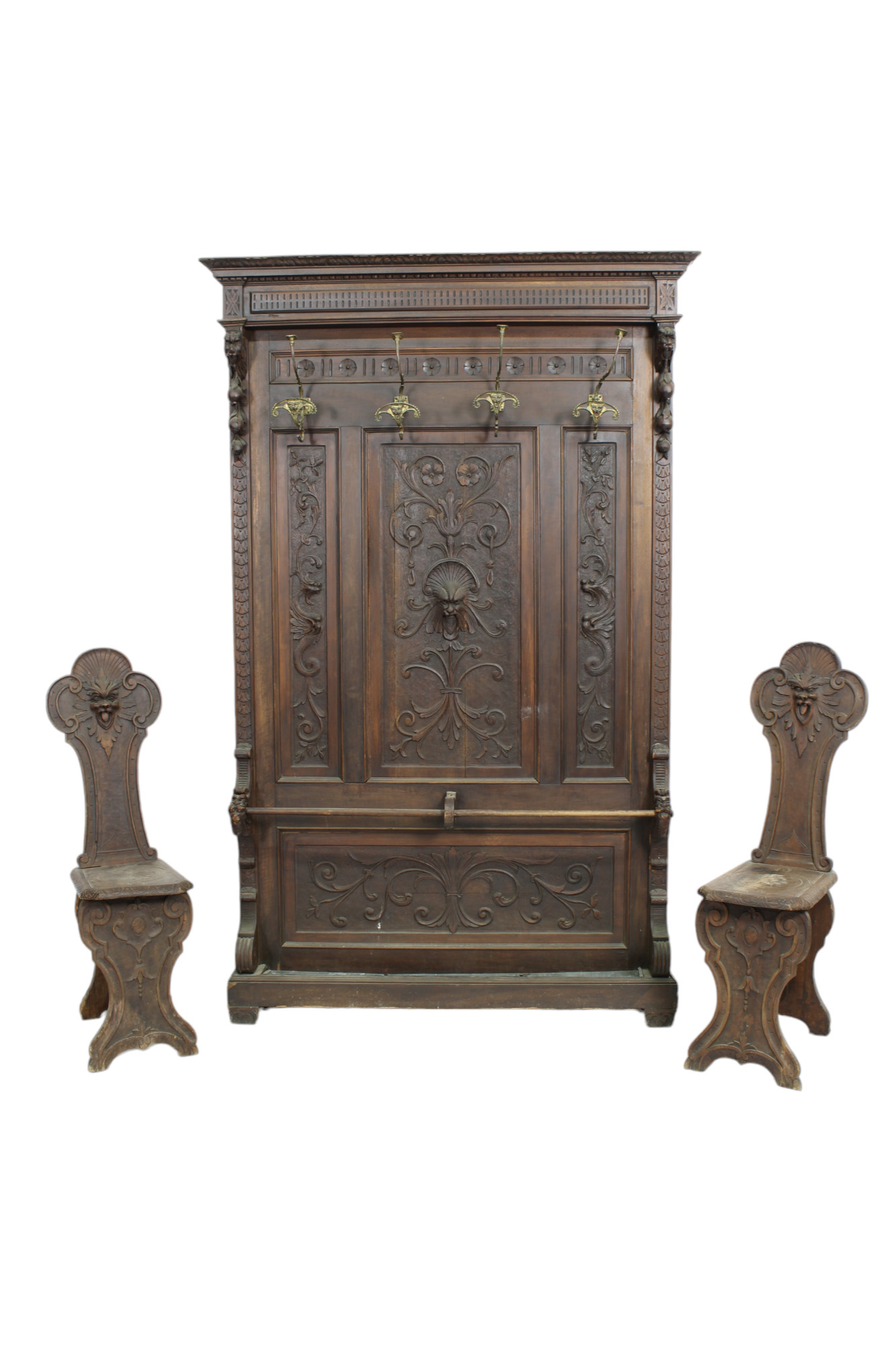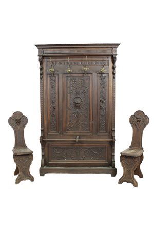 LOTTO COMPOSTO DA 1 ATTACCAPANNI CON BASTONIERA E 2 SEDIE in legno di noce riccamente intagliato Sicilia fine XIX secolo attaccapanni h cm 224 x 124 x 22 / sedie 112,5 x 34 x 46