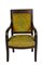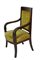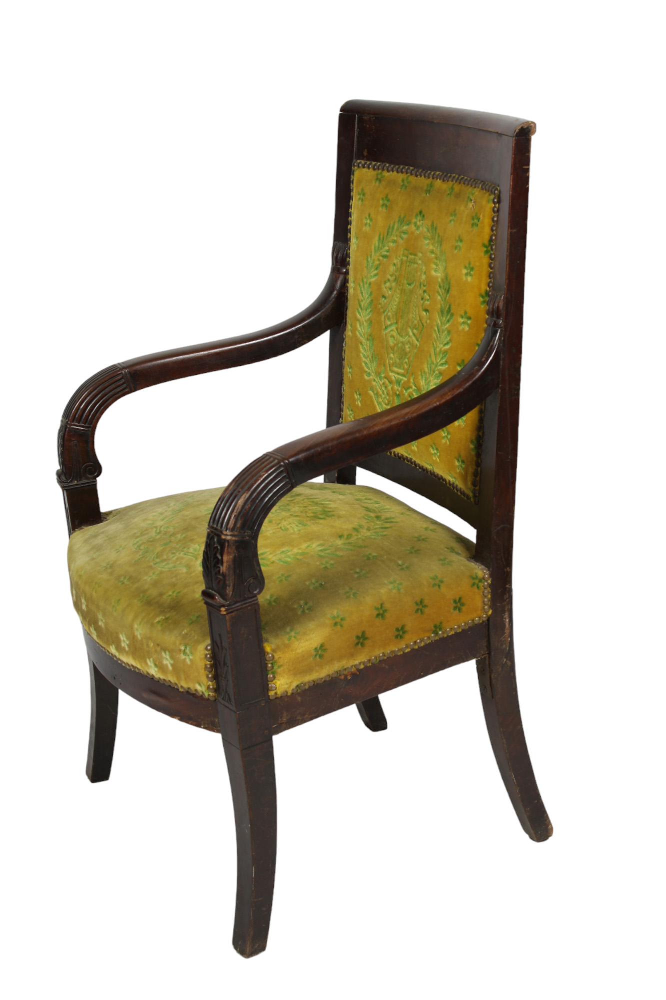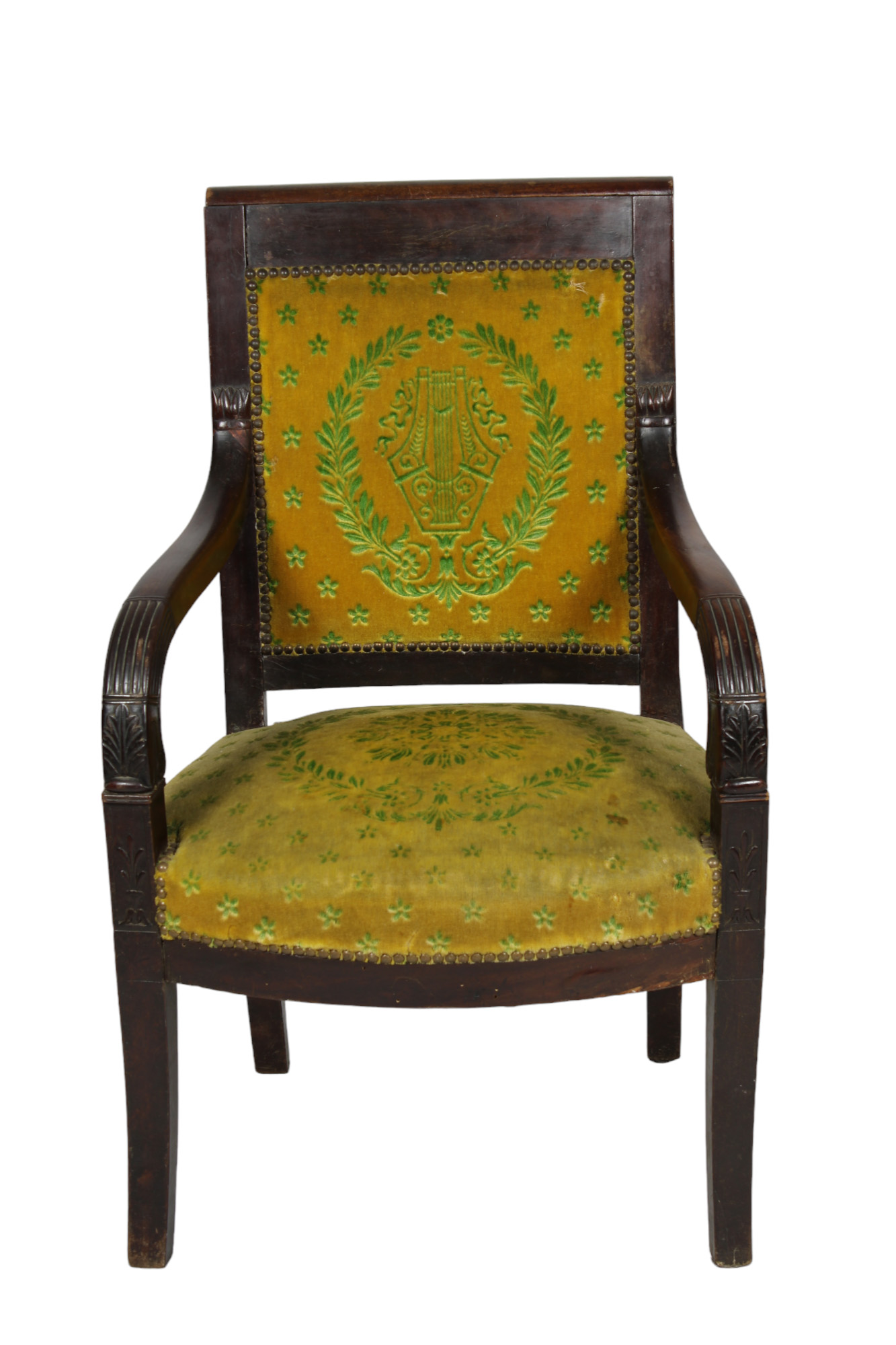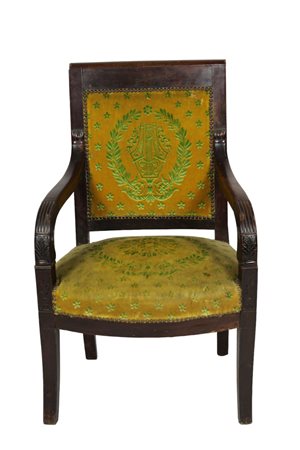POLTRONE DIRETTORIO in mogano scolpito a palmette con tessuto a fondo giallo e verde raffigurante lira Francia XIX secolo h cm 92 x 56 x 50