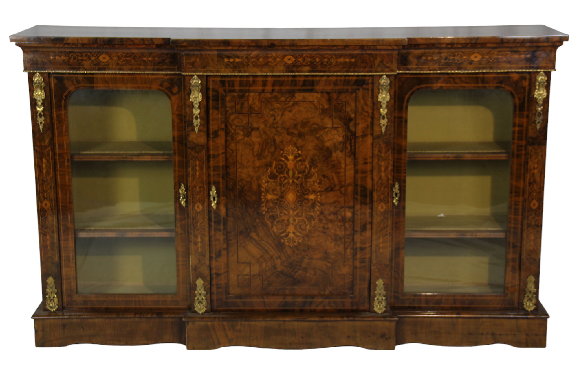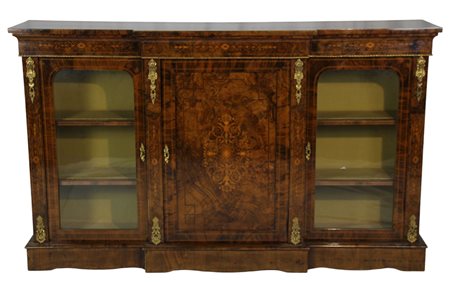 CREDENZA in radica di noce a 3 ante stile inglese, decorata da bronzi ebanisteria italiana XX secolo h cm 113 x 190 x 42