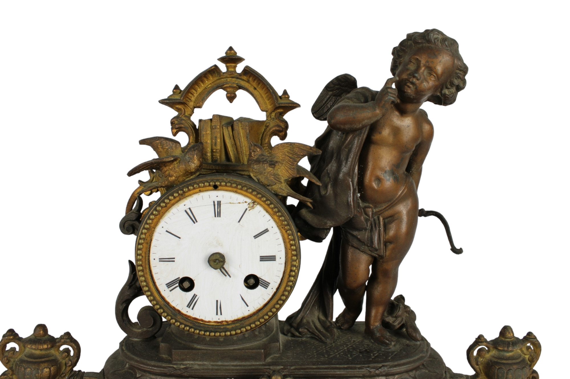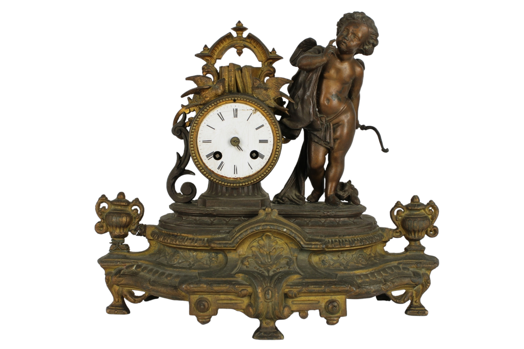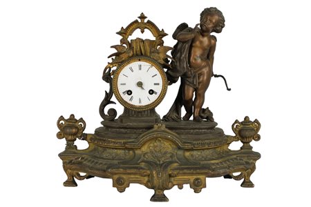 OROLOGIO DA CAMINO in antimonio, decorato da putto Francia XIX secolo h cm 33 x 35 x 13