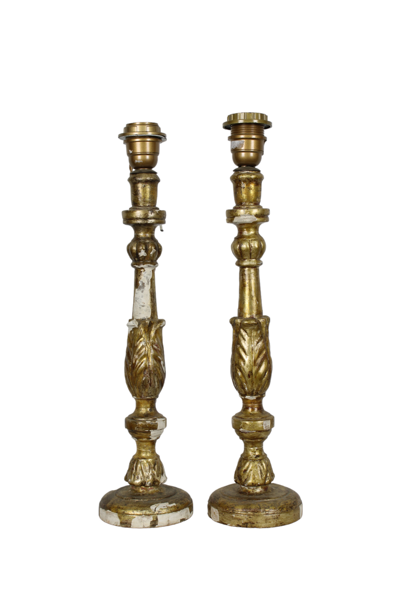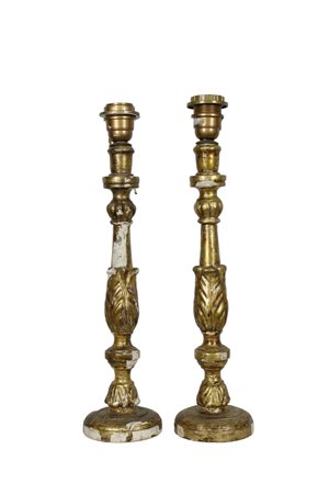 COPPIA DI TORCERI in legno torniti e scolpiti e dorati ad argento e mecca Sicilia XVIII secolo h cm 47,5 x 11