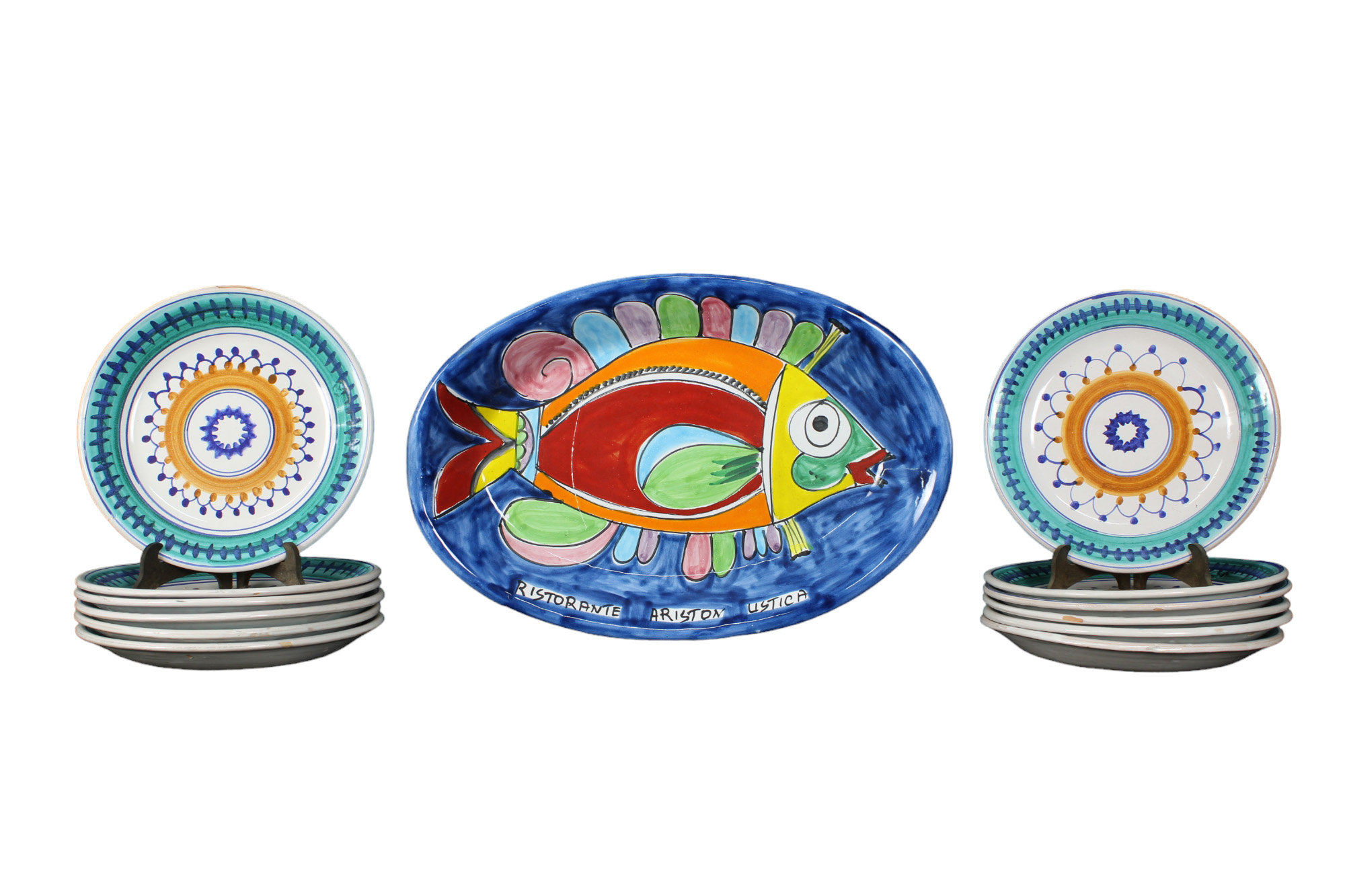 LOTTO COMPOSTO DA 1 grande piatto da portata raffigurante pesce e 12 piatti decorati in terracotta maiolicata Sicilia XX secolo misure varie