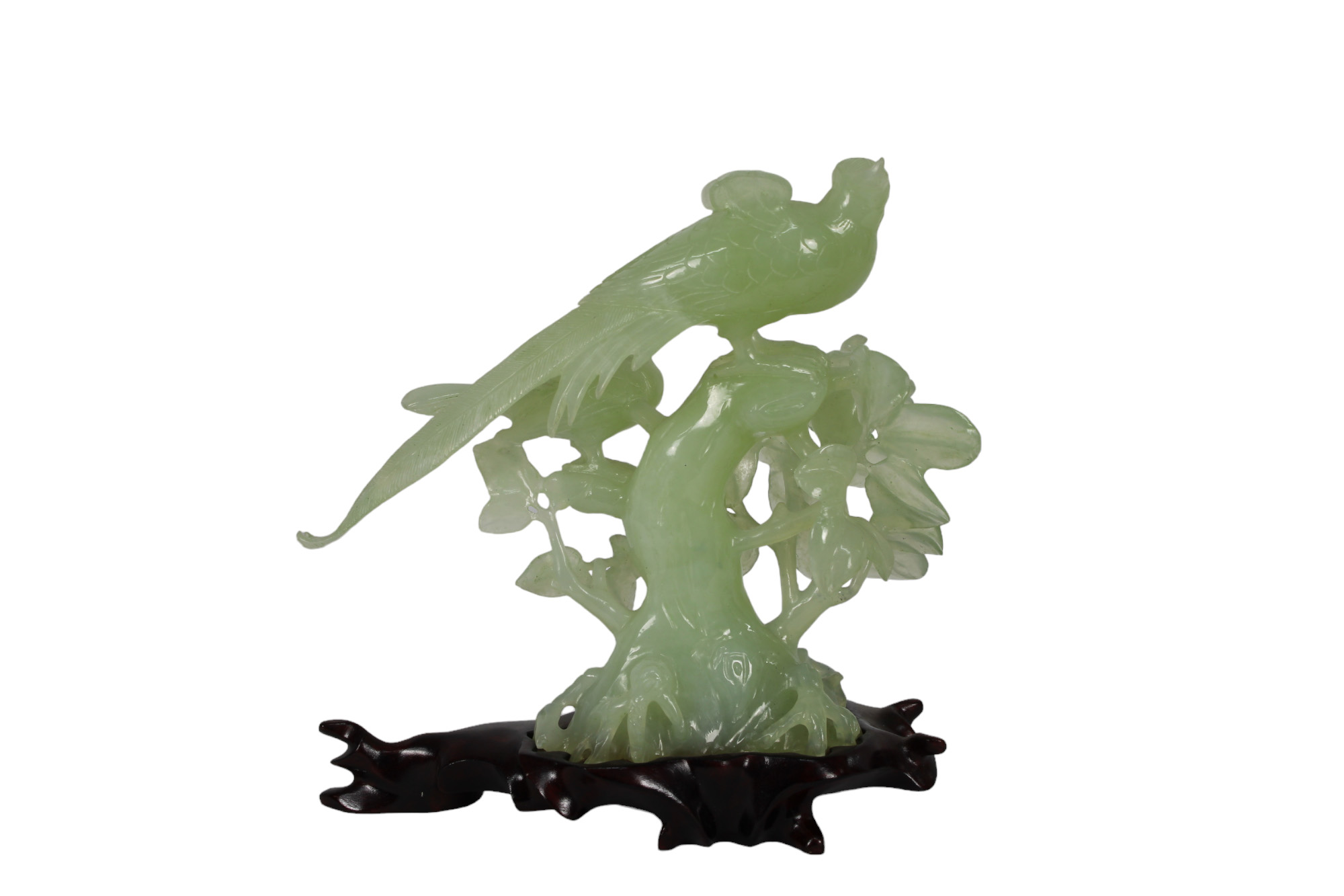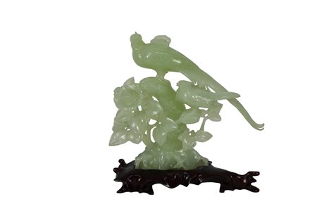 GRUPPO SCULTOREO in giada raffigurante volatili su base in legno manifattura orientale XX secolo h cm 22 x 21 x 7