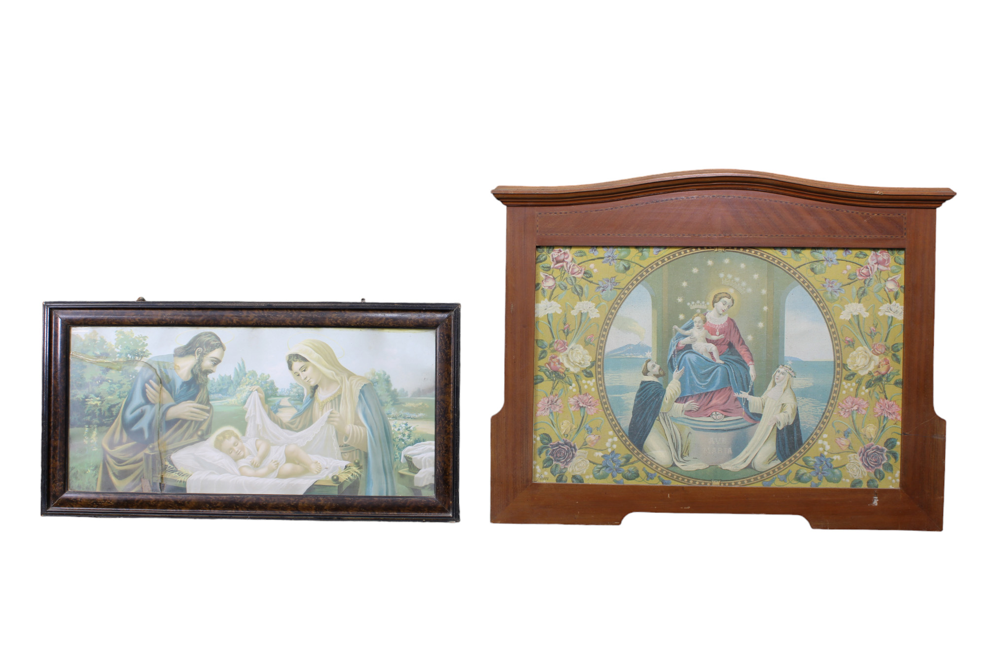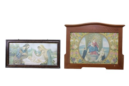 LOTTO COMPOSTO DA PICCOLO ARAZZO raffigurante La Madonna delrosario dentro cornice in legno di noce e marchettata e 1 STAMPA COLORATA raffigurante immagine sacra Sicilia XX secolo h cm 73 x 92 / h cm 45 x 87