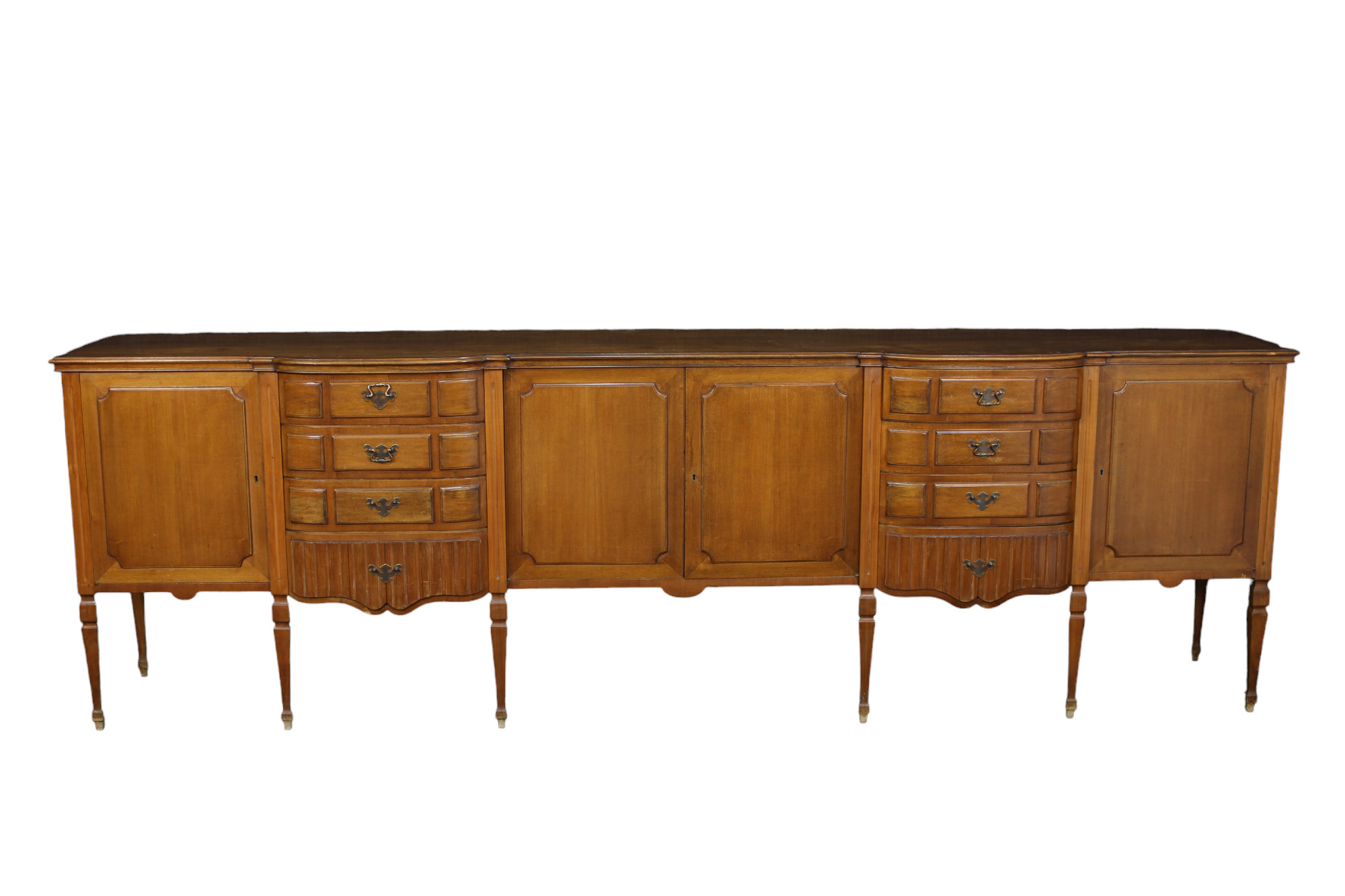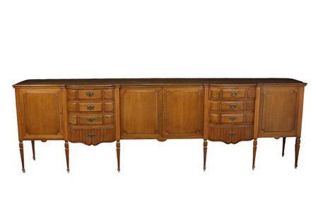 GRANDE CREDENZA in noce a 4 sportelli e due serie di cassetti in noce attribuibili alla fonderia Ducrot Sicilia XX secolo h cm 97 x 306 x 53