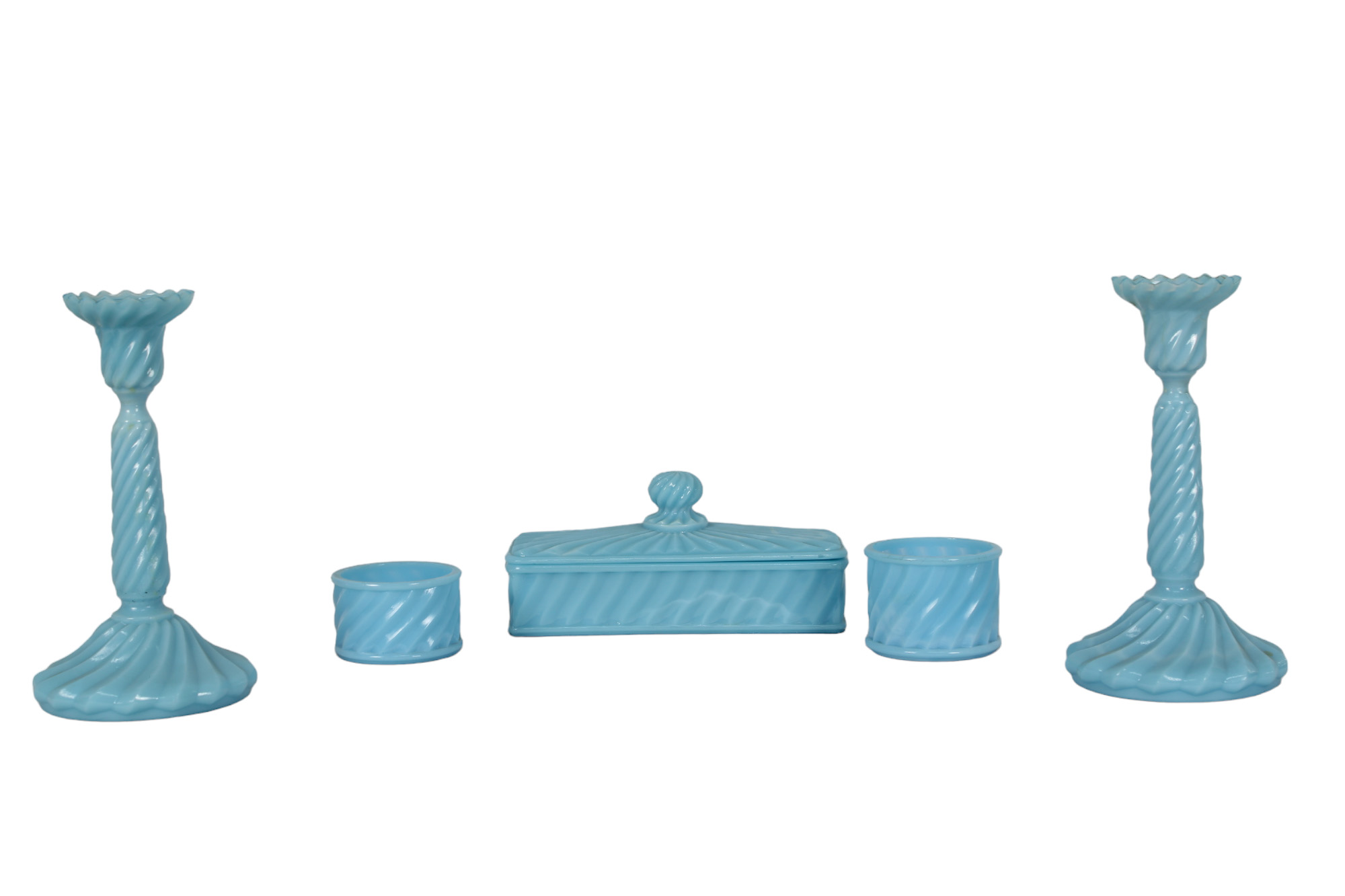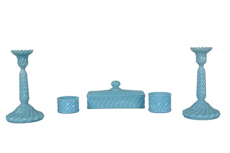 SET DA TOLETTA 5 pezzi in opaline azzurra Francia XX secolo misure varie