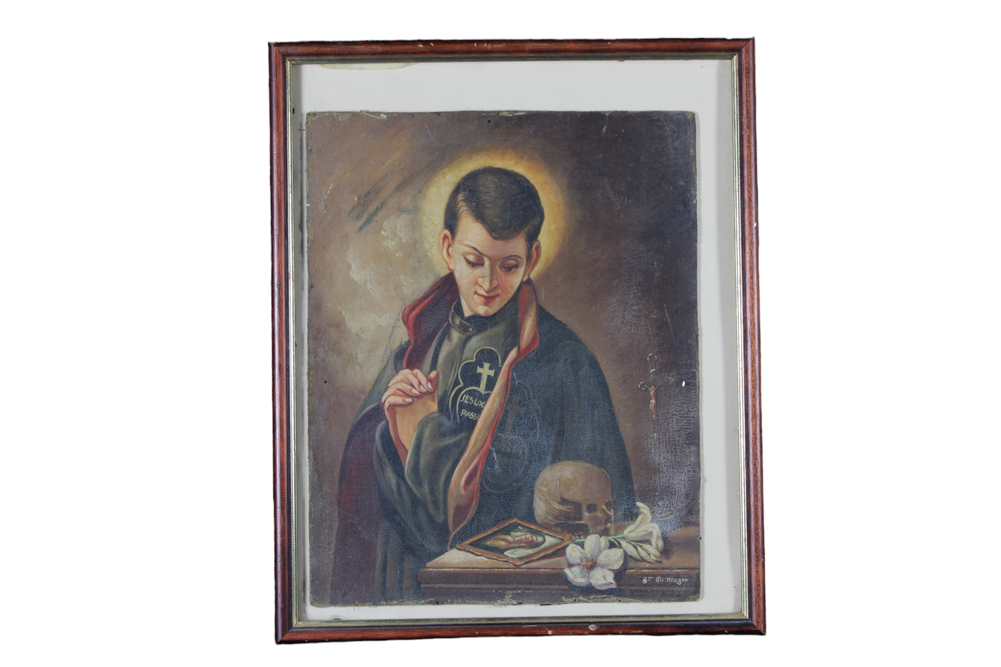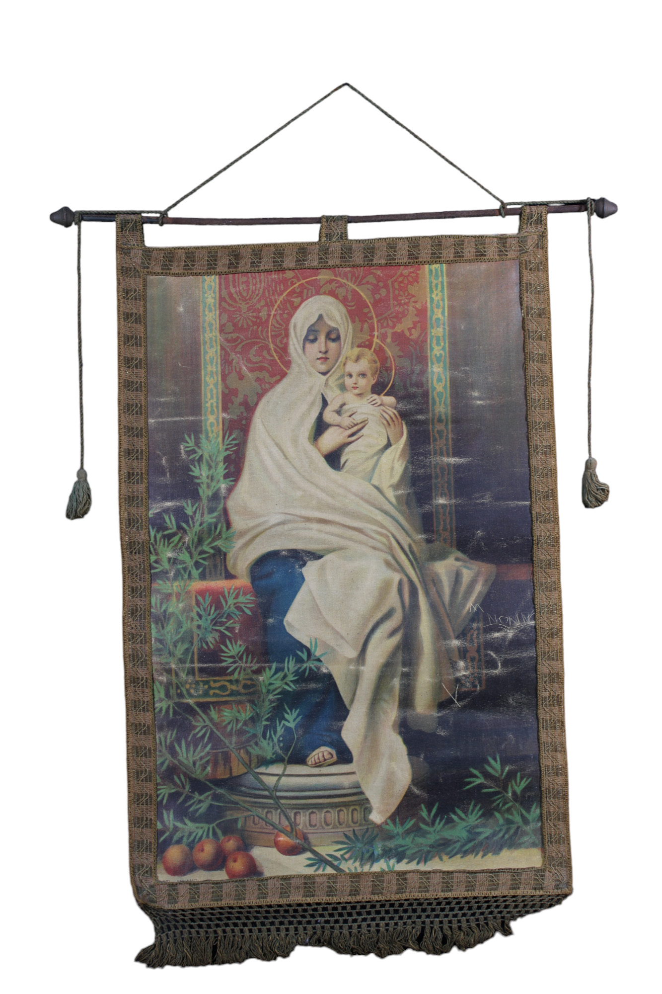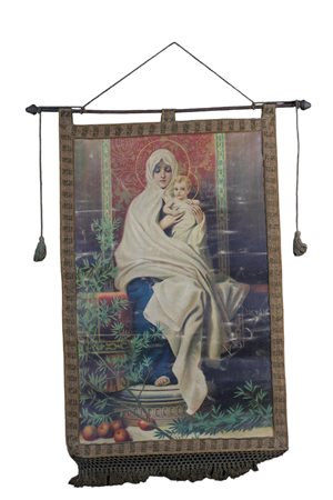 LOTTO COMPOSTO DA 1 OLIO SU TELA raffigurante Santo e 1 STENDARDO stampa su tela raffigurante Madonna con Bambino primi XX secolo h cm 44 x 34 / h cm 102 x 68