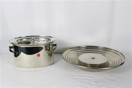 LOTTO COMPOSTO DA CURIOSO CENTROTAVOLA PORTA GHIACCIO E UN CENTROTAVOLA PORTA BOTTIGLIE in acciaio XX secolo misure varie