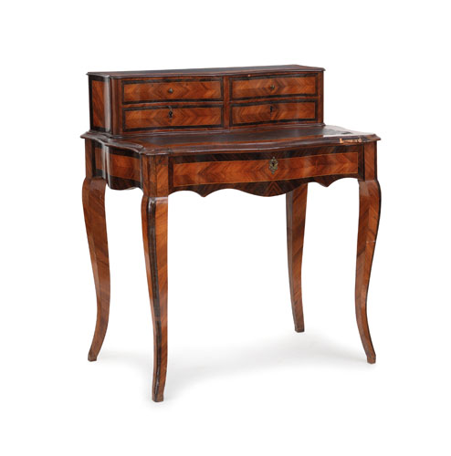 MOBILETTO BONHEUR DU JOUR IMPIALLACCIATO IN LEGNI VARI, FRANCIA, XIX SECOLO, in stile settecentesco con fronte a cassetti e gambe arcuate; sbeccature e mancanze.