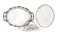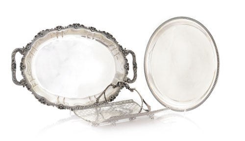 UN CESTINO IN ARGENTO, MILANO, CACCHIONE E DUE VASSOI DIVERSI IN ARGENTO, XX SECOLO, cestino con manico, superficie incisa e bordo traforato, un vassoio ovale con manici e uno circolare con bordo a foglie lanceolate.