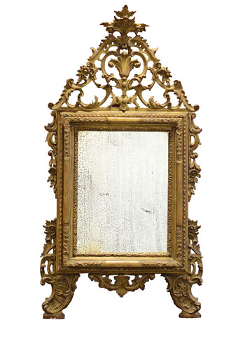 SPECCHIERA IN LEGNO SCOLPITO E DORATO, PIEMONTE, XIX SECOLO, in stile settecentesco con cimasa e fregi a rocaille; difetti, usure e sbeccature.