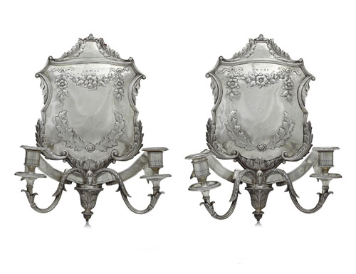 COPPIA DI APPLIQUES VITTORIANE IN ARGENTO, BIRMINGHAM, 1865, a scudo sbalzato a festoni fioriti, bordi a foglie, cartiglio liscio, doppio braccio a volute.