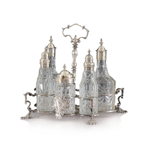 SET DA TAVOLA IN ARGENTO E CRISTALLO, IRLANDA, XVIII SECOLO, base polilobata su piedi a palmetta, fronte con cartiglio rocaille e sostegno cimato da presa a volute, cinque elementi in cristallo con sommità in argento d'epoca successiva.