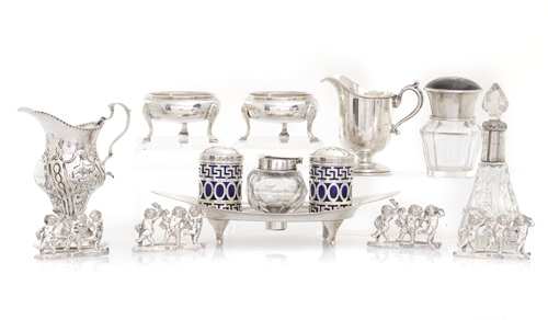 LOTTO DI DIVERSI OGGETTI IN ARGENTO, BIRMINGHAM E LONDRA, XIX-XX SECOLO, composto da un calamaio, quattro segnaposto, due brocchette, un sale e pepe con vetro blu interno, due salierine e due portaprofumo in cristallo e argento; lievi ammaccature.