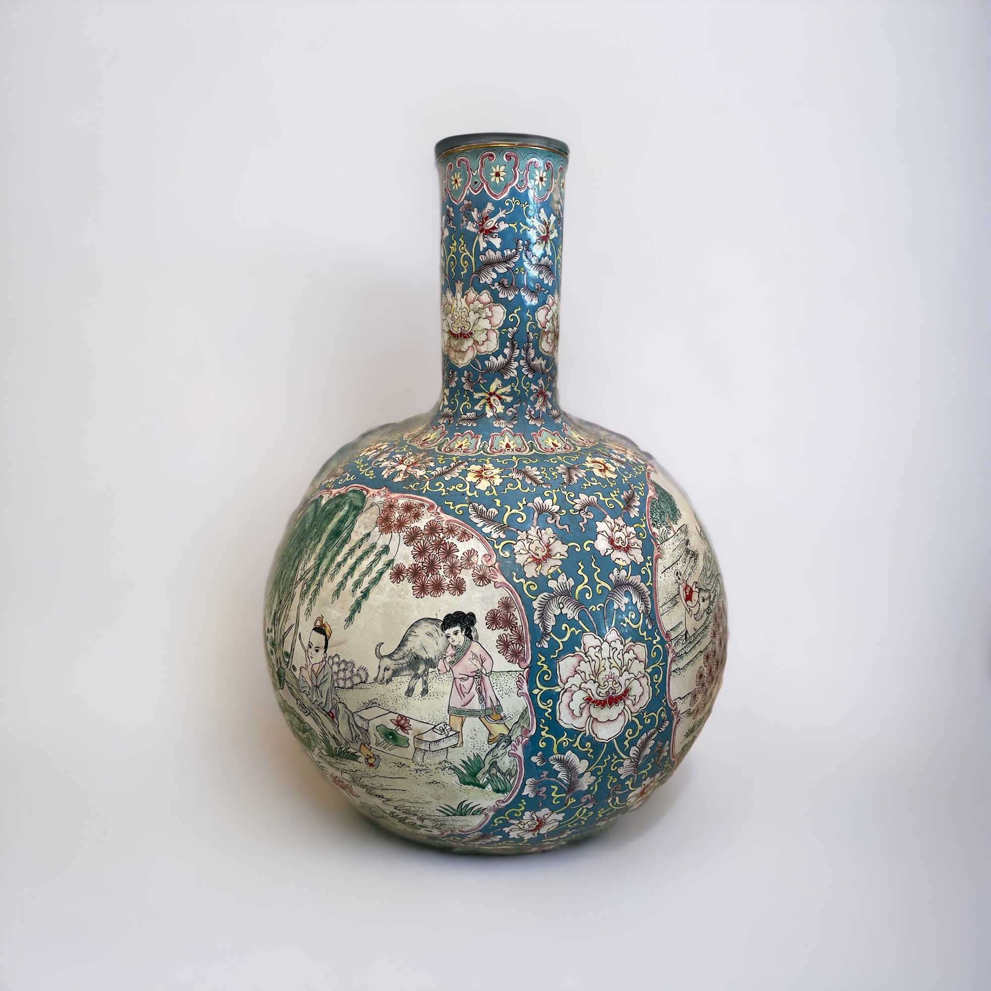 In rame smaltato policromo con decorazioni di scene campestri orientali e motivi floreali. Segnato alla base