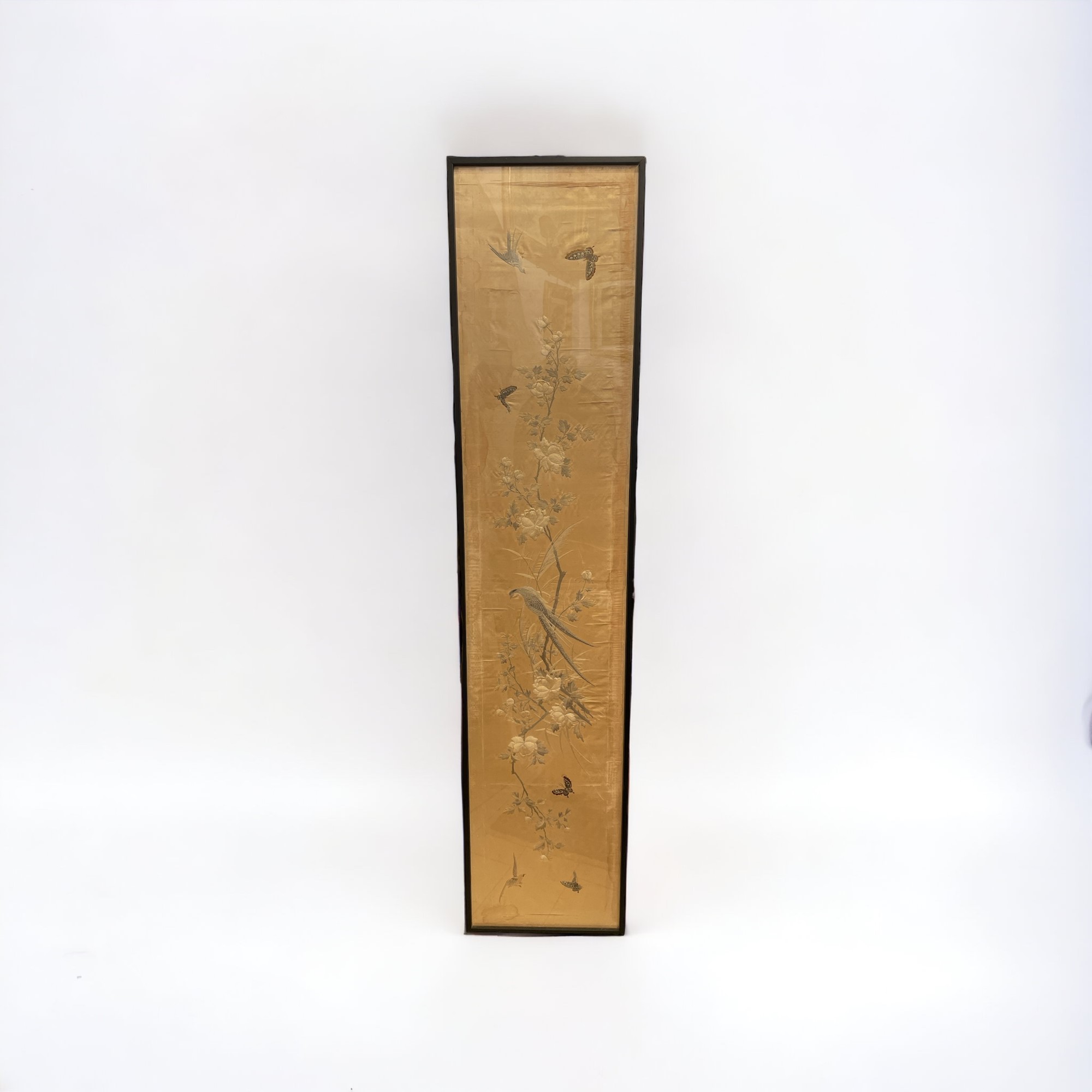 Tessuto di seta montato a pannello inizi del XX secolo seta con ricami 197 x 42 cm