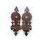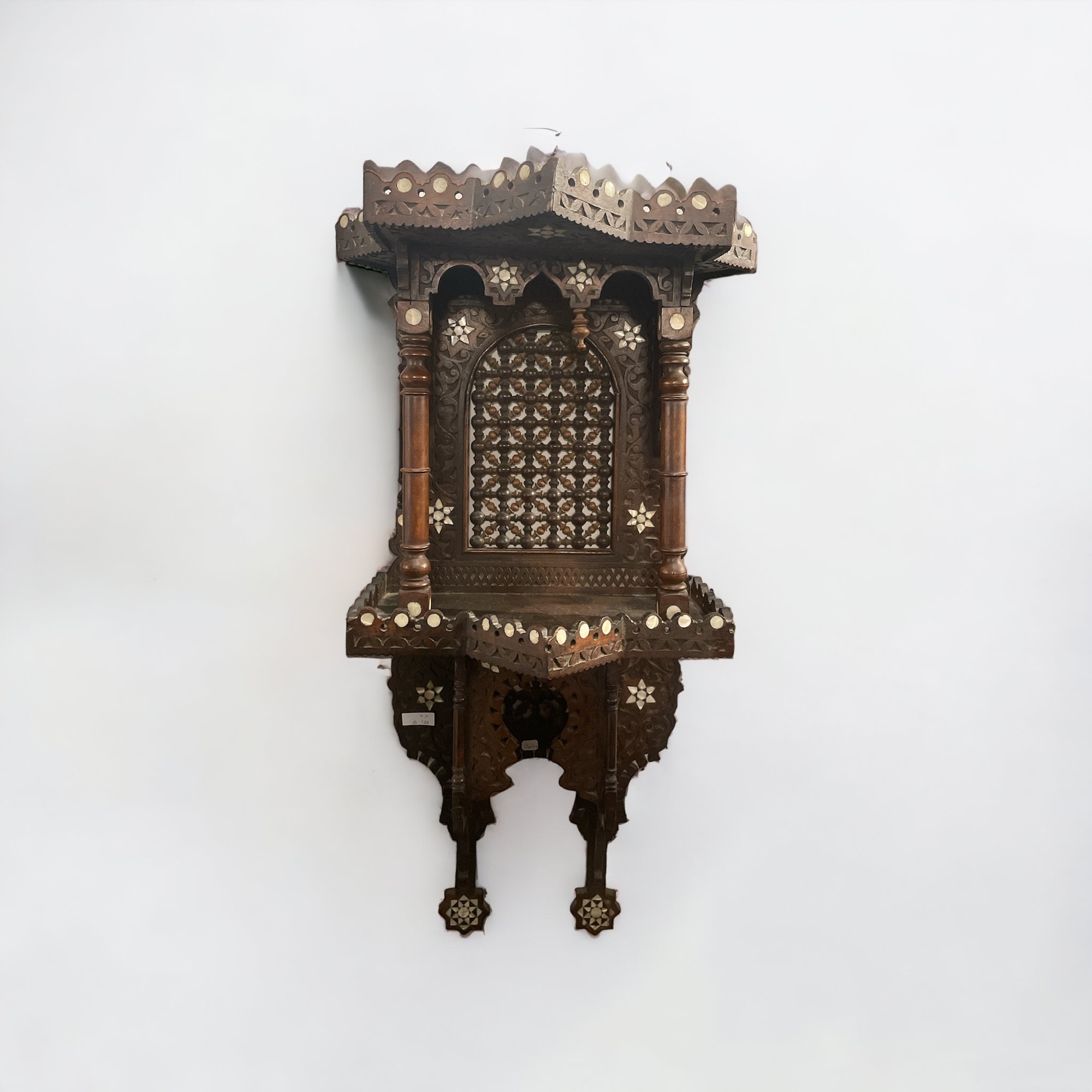 Composto da una mensola angolare a 3 ripiani (88 x 37 x 28cm), una mensola a due ripiani (80 x 40 x 22cm) e una coppia di mensole (58 x 19 x 16cm). In legno intagliato a motivi orientali con intarsi in madreperla. Difetti e mancanze.