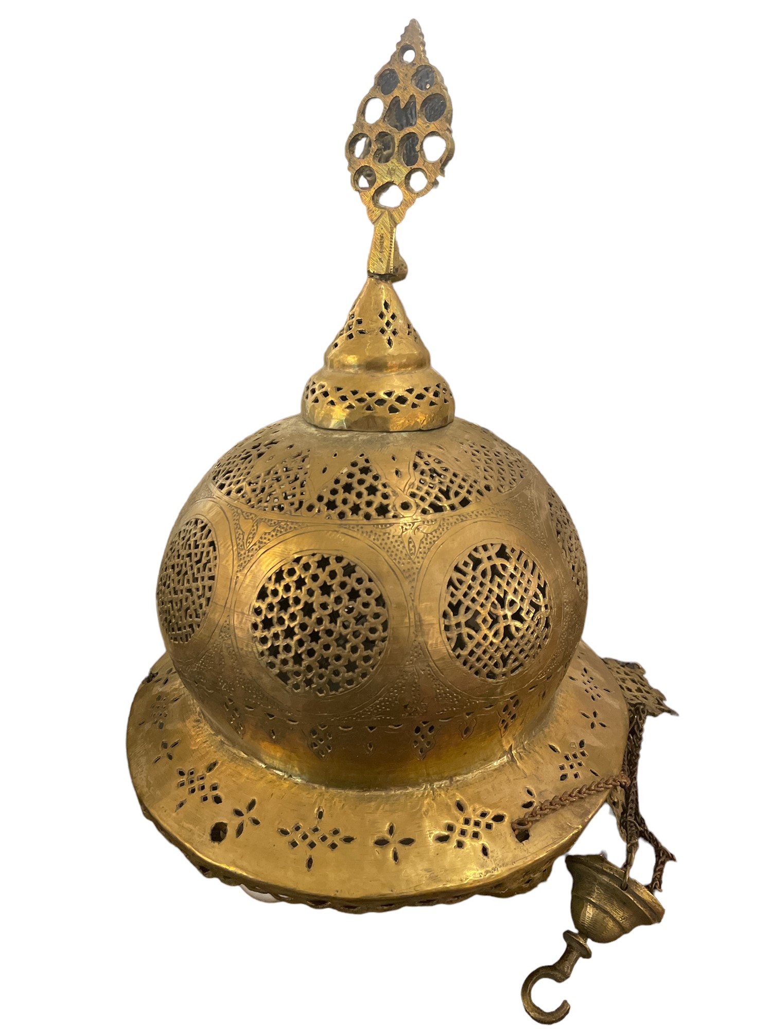 In ottone reticolato con decori a traforo e iscrizioni. Piccoli difetti.