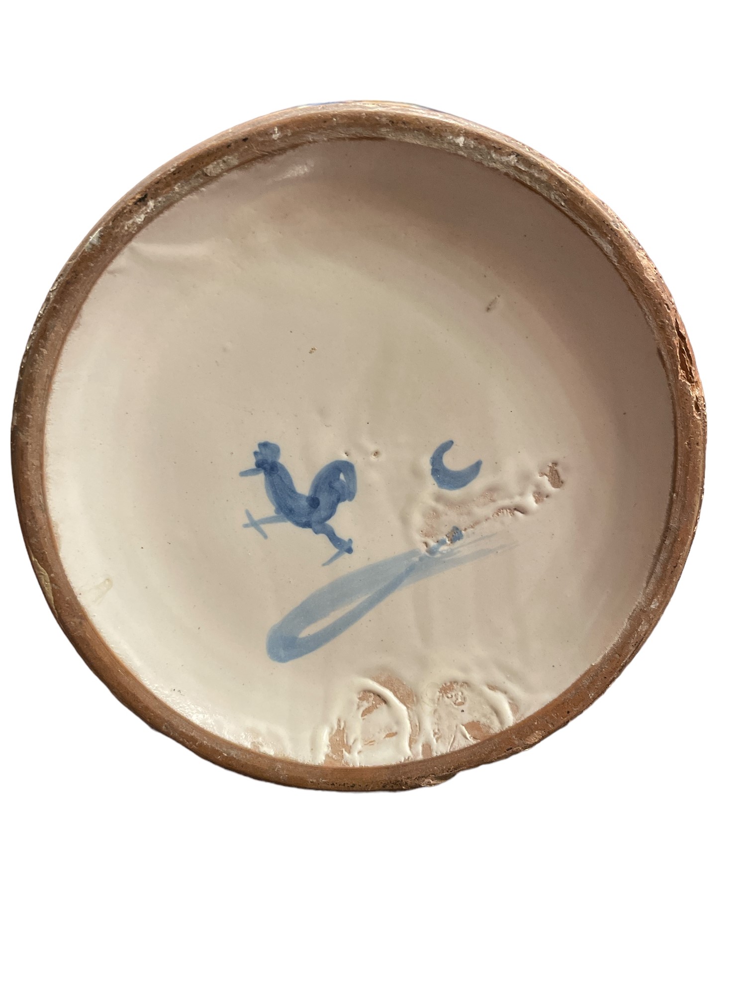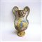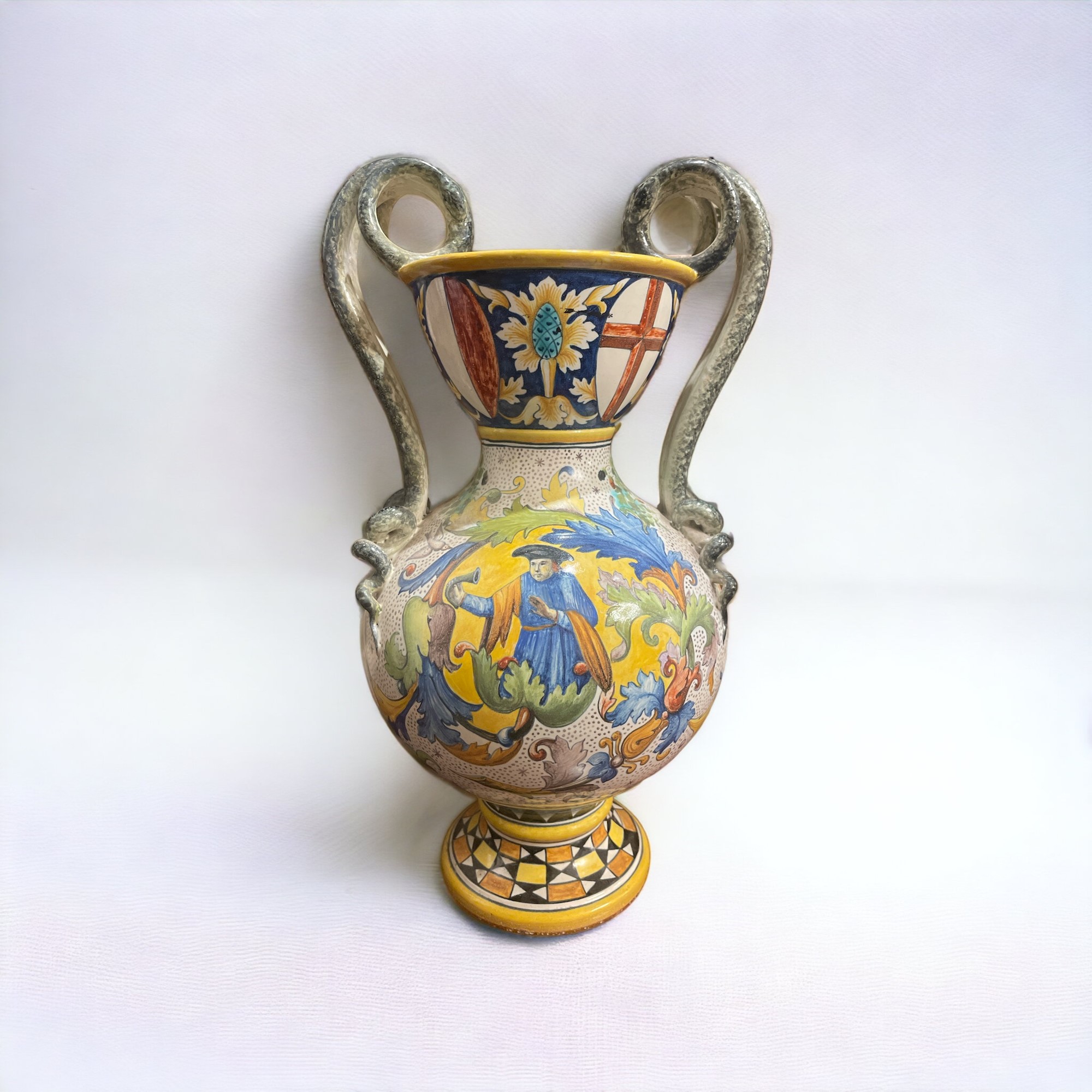 Vaso ad anfora in ceramica, con anse a serpenti intrecciati, corpo a bocciolo, collo rastremato verso l'alto, piede ad anello. Decoro in policromia, con stemma marchionale e personaggio entro riserva gialla. Alla base sotto smalto marcato con gallo in blu.