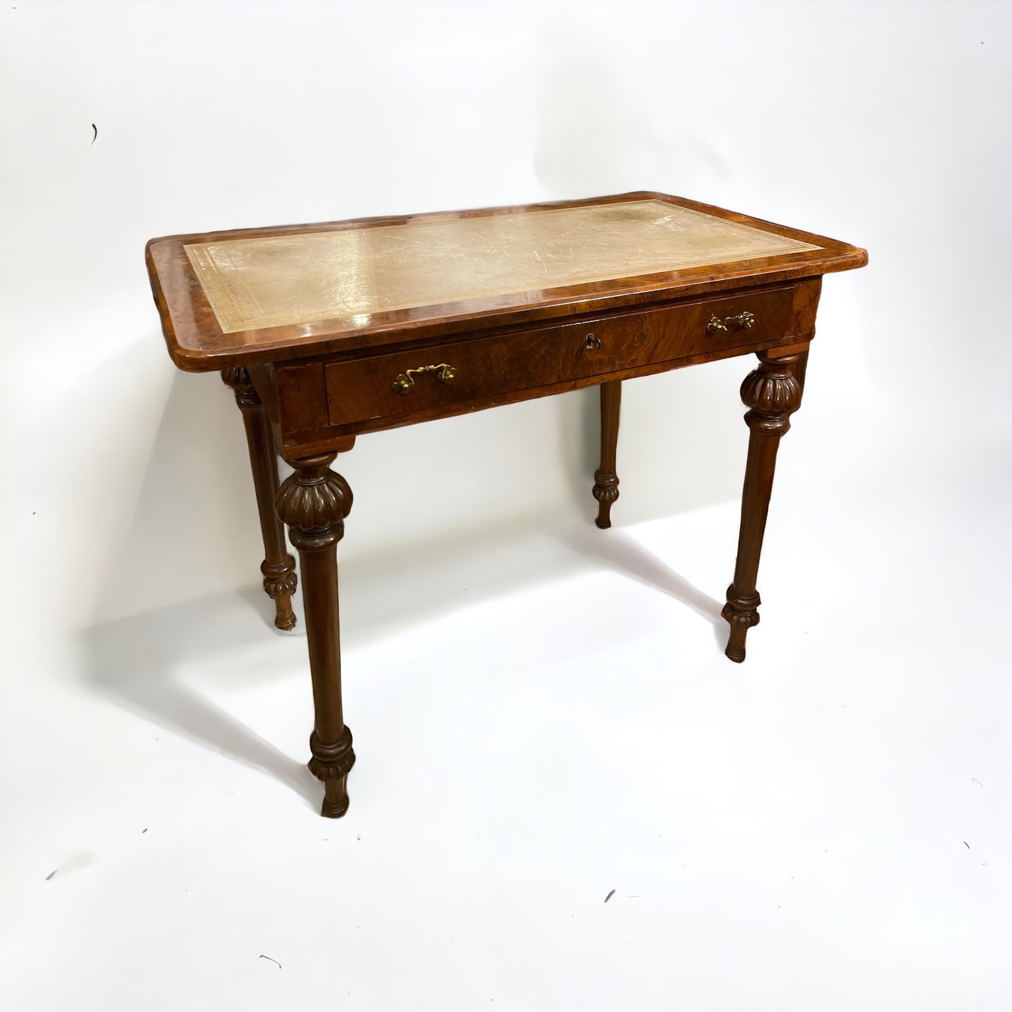 in radica di noce, con cassetto centrale, piano superiore in cuoio. Da restaurare.