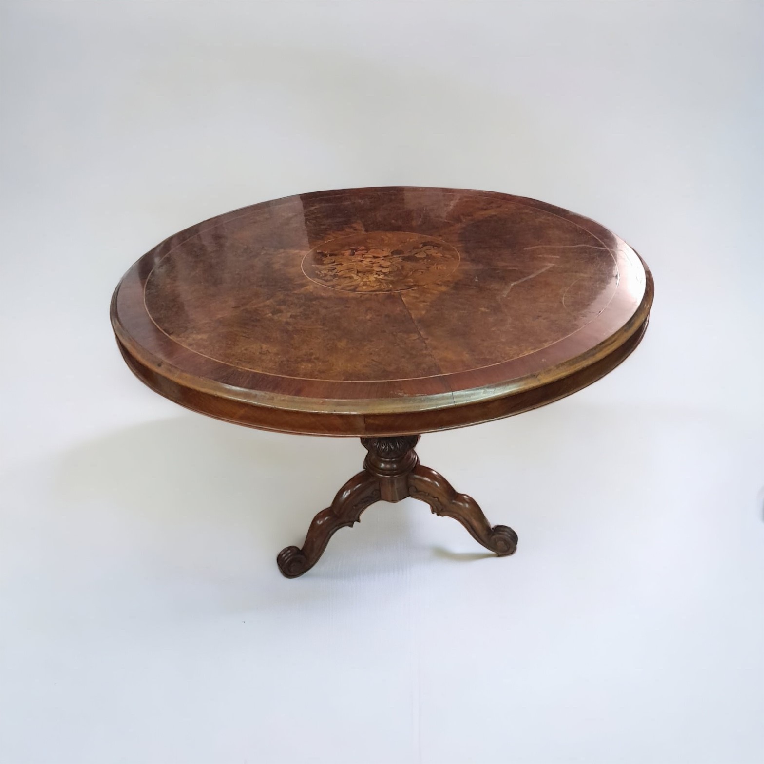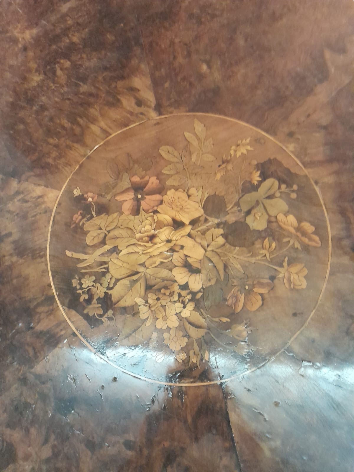 in legno di noce, con piano superiore in legno intarsiato in legni di frutto vari a motivi floreali. Corpo centrale con tre piedi finali. Piccoli diffetti