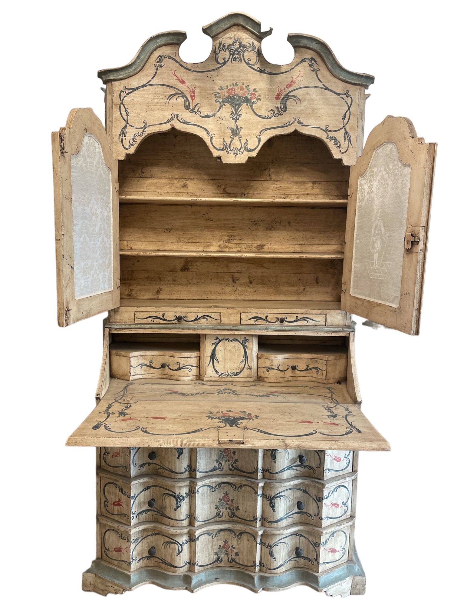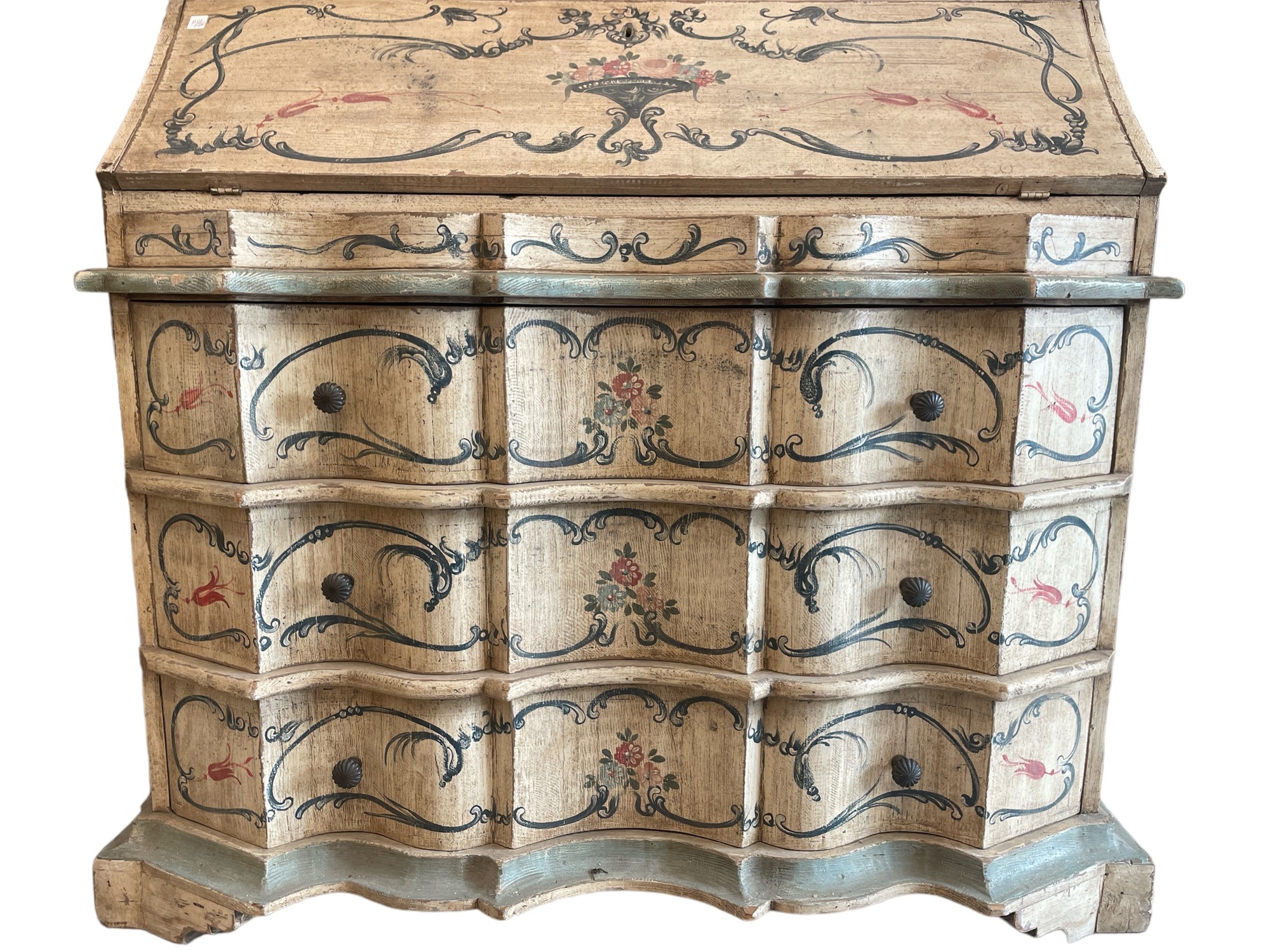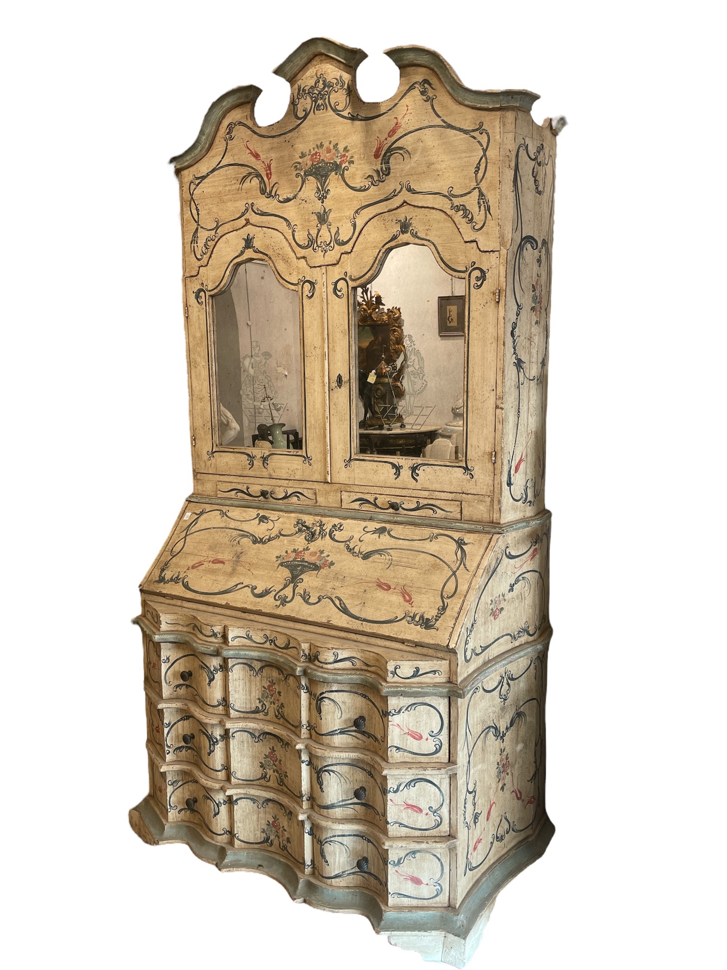 In legno laccato e decorato a motivo floreali, con doppia anta superiore specchiata e parte inferiore a ribalta con scompartimenti interni e 3 cassetti.