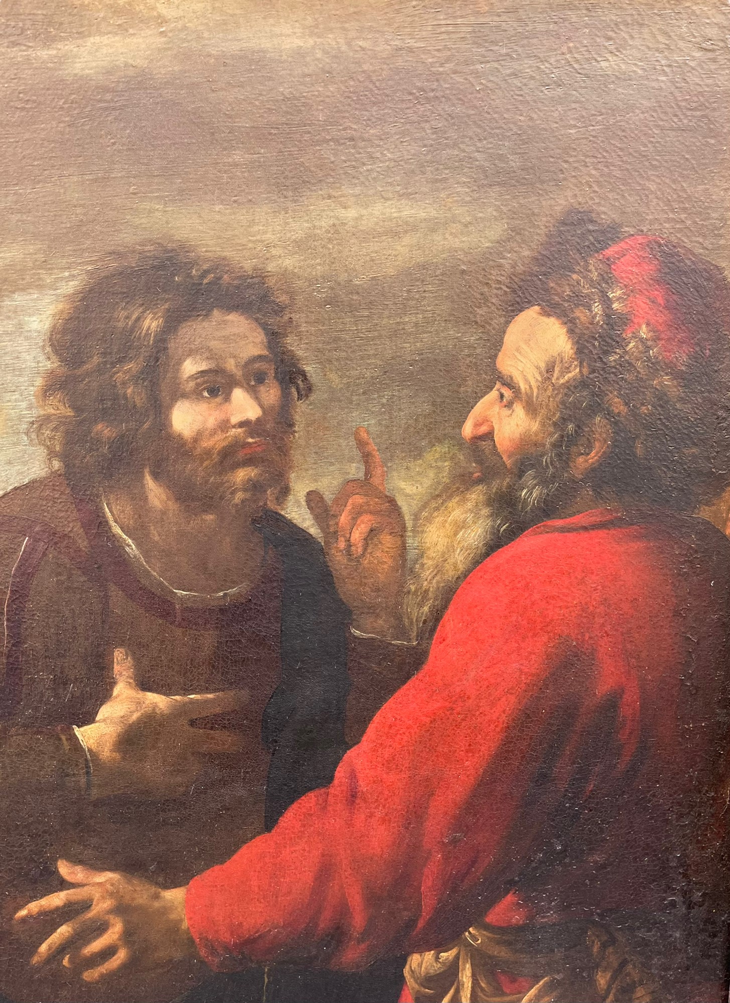 Il soggetto di questo inedito dipinto presenta il brano biblico tratto dal libro della Genovesi (31, 36-42) che narra della fuga di Labano dalla casa del suocero Giacobbe, che aveva servito per tanti anni per potere avere in moglie la bella figlia Rachele.