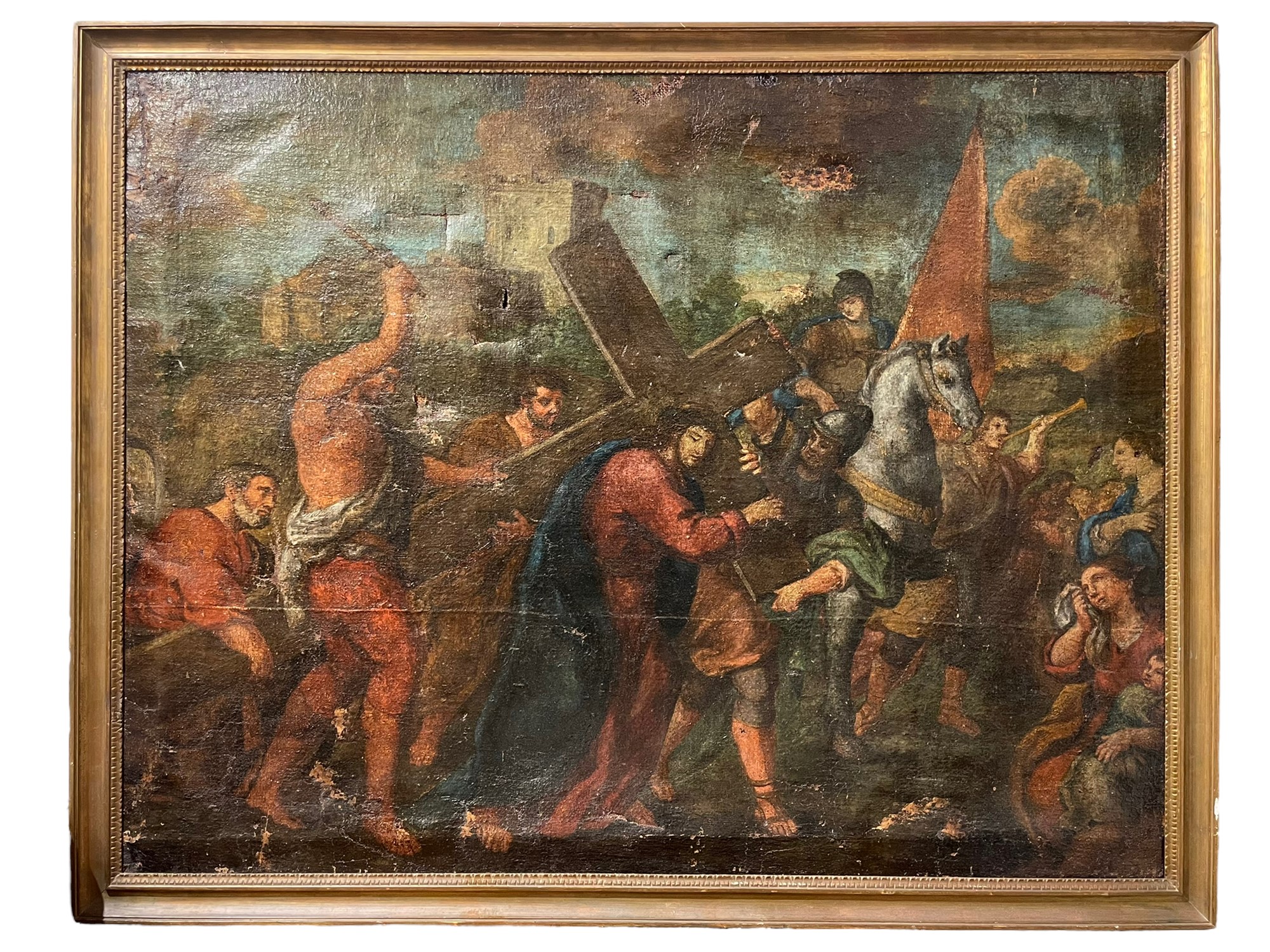 José Luzàn y Martinez (attribuito a) (1710 - 1785) Salita al Calvario XVIII secolo olio su tela cm 104 x 135