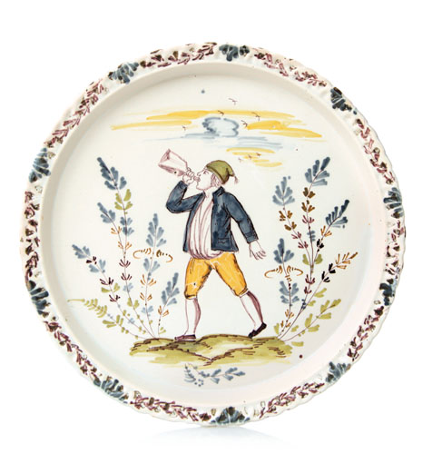 ALZATA IN MAIOLICA, PAVIA, FINE XVIII SECOLO, bordo ritorto, decoro policromo con bevitore entro paesaggio.