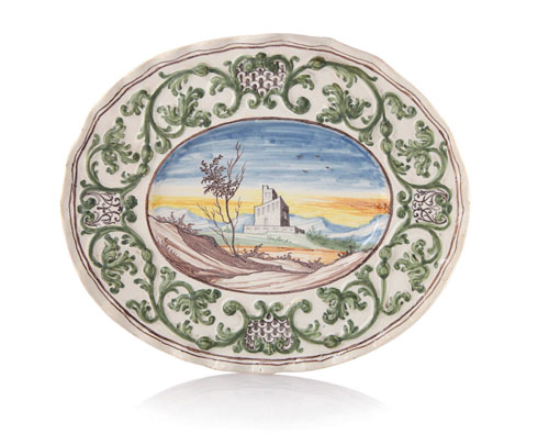 PIATTO OVALE IN MAIOLICA, PAVIA, ULTIMO QUARTO XVII - PRIMA META' XVIII SECOLO, tesa a rilievo con tralci a girali in verde, cavetto con decoro policromo a paesaggio e castelletto.