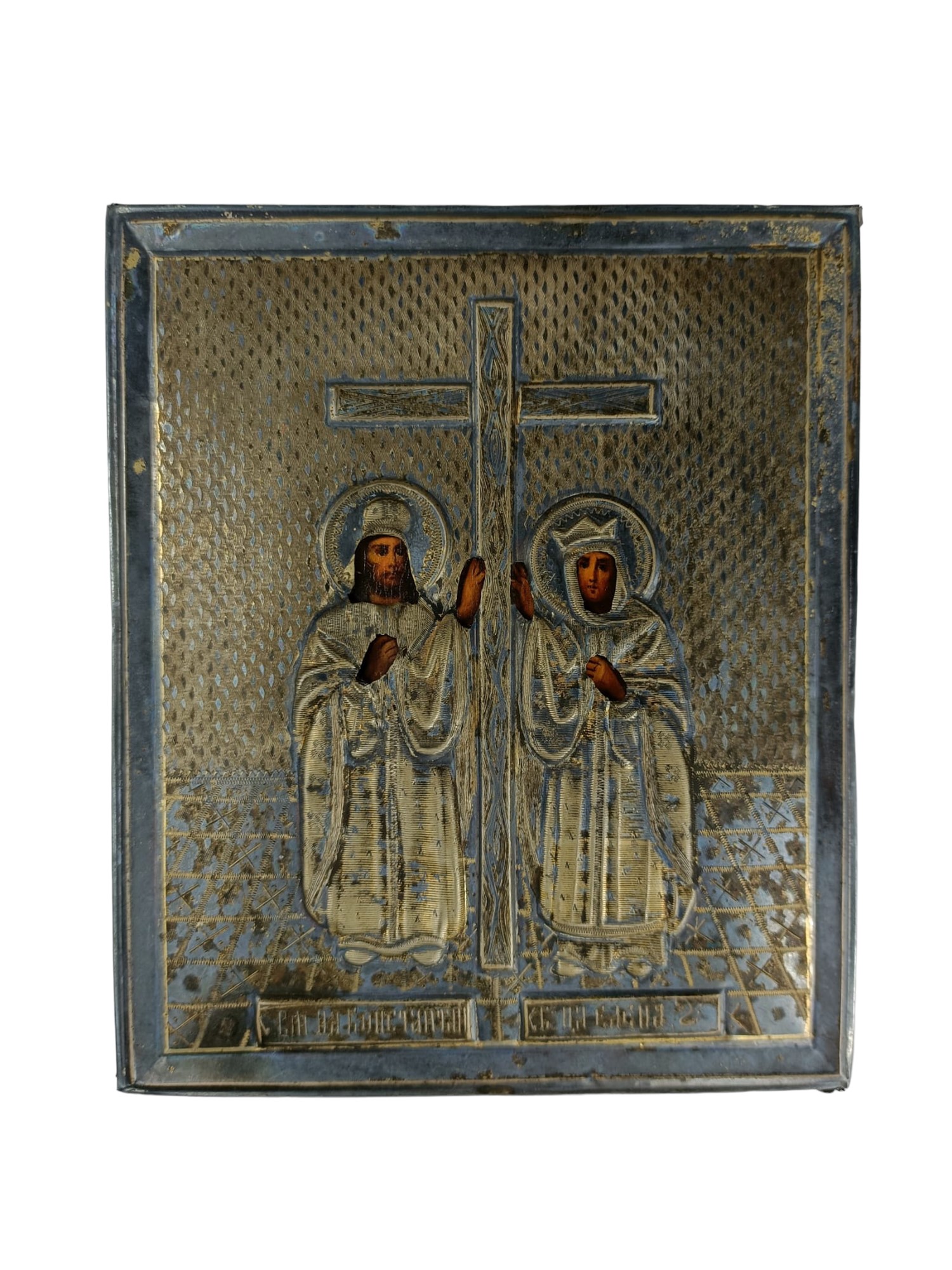 Icona con riza in argento e bolli russi datati 1884. Arte russa.