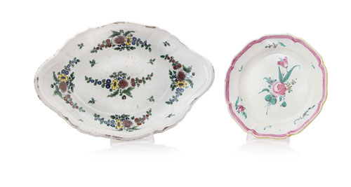 UN BACILE E UN PIATTO IN MAIOLICA, FAENZA, FERNIANI, FINE XVIII SECOLO, bacile ovale con bordo centinato, decoro policromo "al fiorazzo"; cadute di smalto ai bordi; piatto con decoro a mazzetto e fiori sparsi