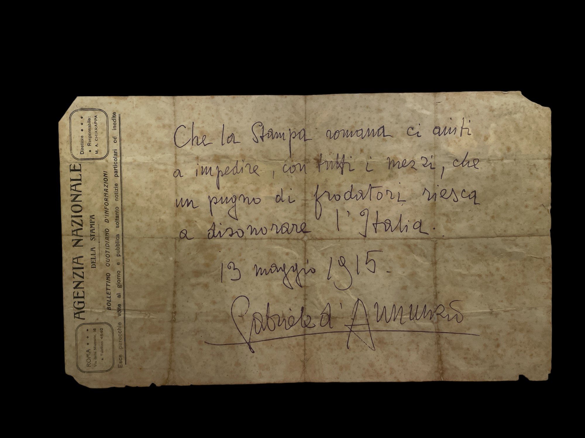 Su carta intestata Agenzia Nazionale della Stampa. Datato 13 maggio 1915. Mancanze.