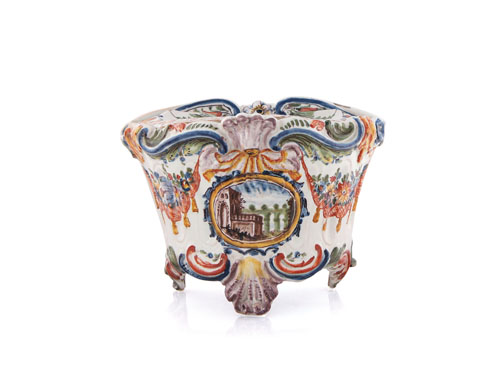 FIORIERA IN MAIOLICA, MILANO, P.RUBATI, XVIII SECOLO, a mezza luna, scanalata e sagomata a volute e conchiglie, coperchio forato, decoro policromo a festoni fioriti e centrata da riserva con paesaggio con ruderi; qualche caduta di smalto.