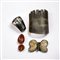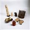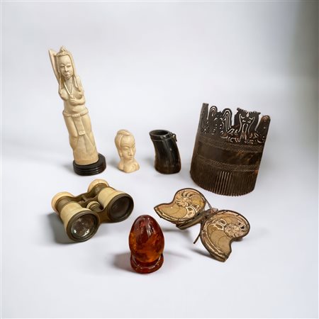 In materiali diversi. Di cui un fermacapelli, due sculture in resina, un uovo in pietra dura, una farfalla in pietra fossile e un cannocchiale.