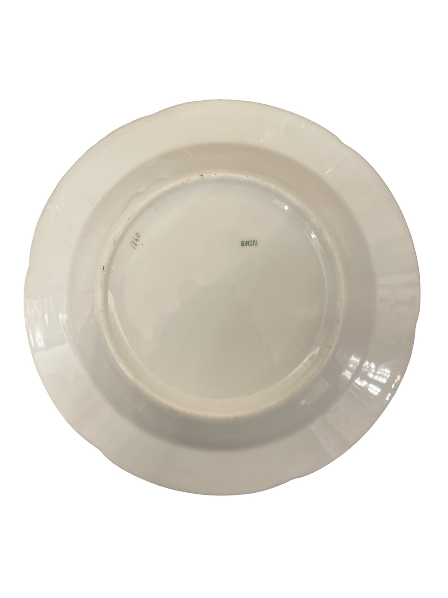 Marchiato "Ginori" in verde. Composto da: 12 piatti (diametro 23 cm), 12 piatti da dessert, 6 piatti fondi, 1 zuppiera con coperchio, 1 insalatiera, 2 piatti da portata rotondi, 2 piatti da portata ovali, 2 antipastiere, 1 salsiera (senza cucchiaio), 1 piccola salsiera con cucchiaino; 1 teiera, 1 lattiera, 1 zuccheriera, 6 tazzine, 6 piattini.