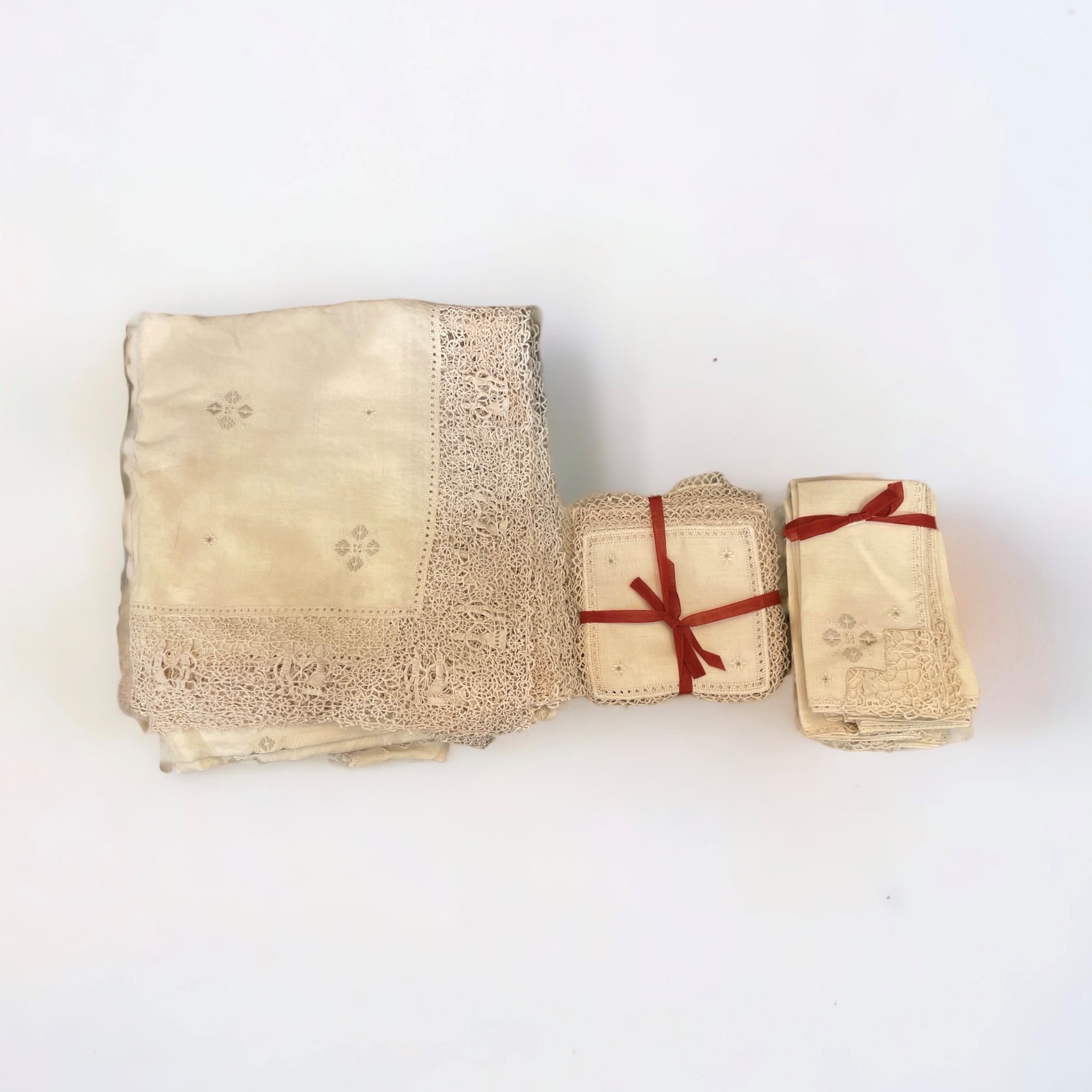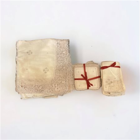 Con grandi inserti al bordo e nella parte centrale ad ago. Compresa di 12 tovaglioli grandi e 12 tovaglioli piccoli, ricamati e con inserti ad ago. Manifattura dell'Italia centrale.