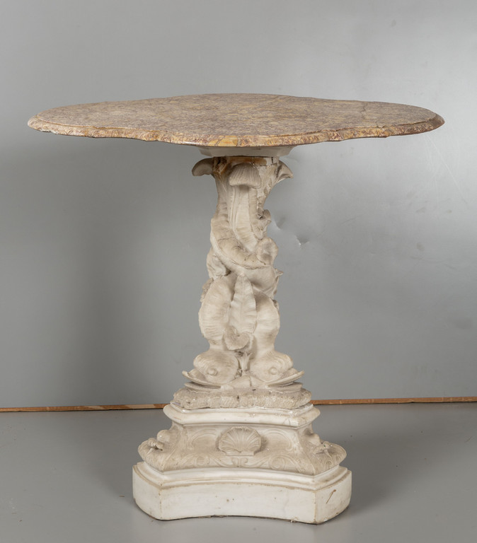 Tavolo di gusto eclettico in marmo scolpito a motivi di delfini attorcigliati piano in broccatello di Spagna sec.XIX