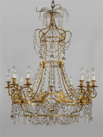 Lampadario in bronzo dorato a dodici luci ricca decorazione in cristallo Nord Europa sec.XIX